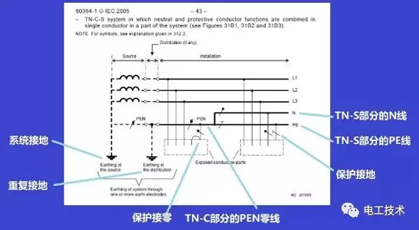 IEC还把TN-C系统与TN-S接地系统联合起来,形成TN-C-S接地系统。