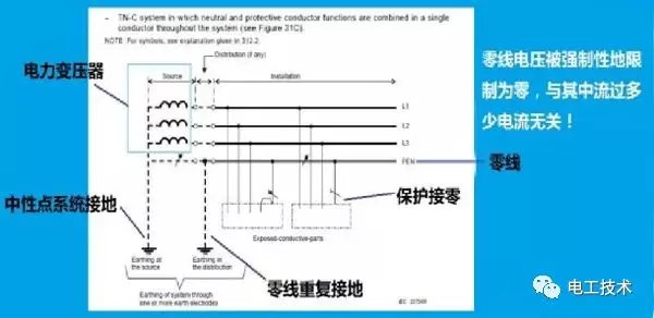 这张图中,我们看到了变压器低压侧绕组的中性线N执行了工作接地,并且以PEN零线的形式引出。注意到在负载侧的引入端,零线再次重复接地,其目的是确保零线线路末端的电位依然为零。这样做的就能够防止零线过长引起零线末端的零电位偏离,防止因为零线断裂而引起的零电位偏离。