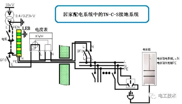 在居家配电的入口处,零线PEN首先接到重复接地的扁钢LEB处,在这里一分为二,成为PE地线和N中性线。从这里开始,接地系统变成TN-S。由于它是经由TN-C改变接线而得到的,因此IEC把它叫做TN-C-S接地系统。