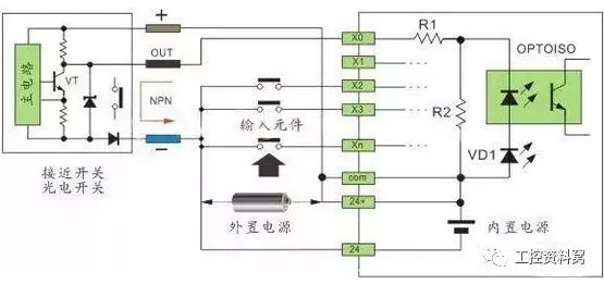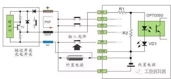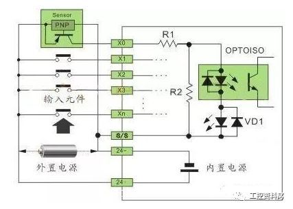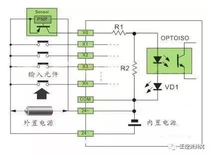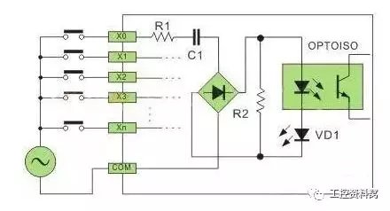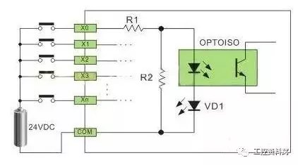 一、概述 PLC 的数字量输入接口并不复杂,PLC 为了提高抗干扰能力,输入接口都采用光电耦合器来隔离输入信号与内部处理电路的传输。因此,输入端的信号只是驱动光电耦合器的内部 LED 导通,被光电耦合器的光电管接收,即可使外部输入信号可靠传输。