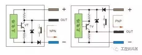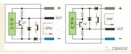 (3)S/S端子接法参考图5-图6以及图11-图12。 3、有源三线传感器(电感接近开关、电容接近开关、霍尔接近开关、光电开关等)直流有源三制线接近开关与光电开关输出管使用三极管输出,因此传感器分NPN和PNP输出,有的产品是四线制,有双NPN或双PNP,只是状态刚好相反,也有NPN和PNP结合的四线输出。 NPN型当传感器有检测信号VT导通,输出端OUT的电流流向负极,输出端OUT电位接近负极,通常说的高电平翻转成低电平。 PNP型当传感器有检测信号VT导通,正极的电流流向输出端OUT,输出端OUT电位接近正极,通常说的低电平翻转成高电平。 电路中三极管的发射极上的电阻为短路保护采样电阻2-3Ω不影响输出电流。三极管的集电极的电阻为上拉与下拉电阻,提供输出电位,方便电平接口的电路,另一种输出的三极管集电极开路输出不接上拉与下拉电阻。 简单说当三极管VT导通,相当与一个接点导通,如图13:
