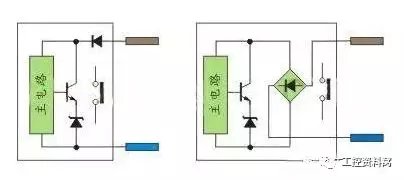 注:24VDC供电的传感器,在输入回路上需要串联限流电阻,R1为10Ω,R2为2KΩ,不串联限流电阻,将烧毁接口回路,限流电阻取值2.7KΩ。 三、外部输入元件 1、无源干接点(按钮开关、行程开关、舌簧磁性开关、继电器触点等) 无源干接点比较简单,接线容易。不存在电源的极性,压降等因素,上图3-6中的输入元件这是此类型。这里不重复介绍。 2、有源两线制传感器(接近开关、有源舌簧磁性开关) 有源两线接近开关分直流与交流,此传感器的特点就是两根线,传器输出端导通后,为了保证电路正常工作需要一个保持电压来维持电路工作,通常在3.5-5V的压降,静态泄露电流要小于1mA,这个指标很重要;如果过大,在接近开关没检测信号时,就使PLC的输入端的光电耦合器导通。我公司的LJK系列两线制接近开关静态泄露电流控制在0.35-0.5mA之间适应各类型PLC。 直流两线制接近开关分二极管极性保护与桥整流极性保护,前者在接PLC时需要注意极性,后者就不需要注意极性。有源舌簧磁性开关主要用在汽缸上做位置检测,由于需要信号指示,内部有双向二极管回路,因此也不需要注意极性;交流两线制接近开关就不需要注意极性。如图10: