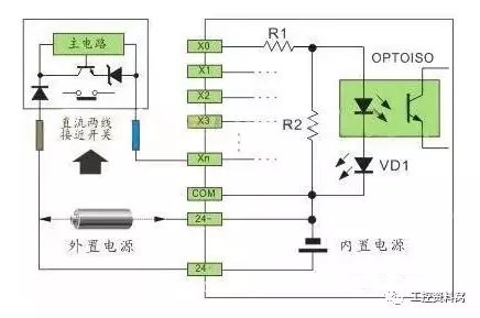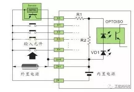 以上的情况只是针对,传感器是属于常开的状态下。 3、按电源配置类型 (1) 直流输入电路 如图1,直流输入电路要求外部输入信号的元件为无源的干接点或直流有源的无触点开关接点,当外部输入元件与电源正极导通,电流通过R1,光电耦合器内部LED,VD1(接口指示)到COM端形成回路,光电耦合器内部接收管接受外部元件导通的信号,传输到内部处理;这种由直流电提供电源的接口方式,叫直流输入电路; 直流电可以由PLC内部提供也可以外接直流电源提供给外部输入信号的元件。R2在电路中的作用是旁路光电耦合器内部LED的电流,保证光电耦合器LED不被两线制接近开关的静态泄漏电流导通。
