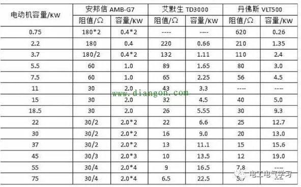 下图所示为部分变频器生产厂家提供的制动电阻的阻值与容量。