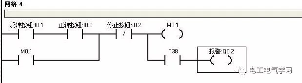 首先在2个自保持回路中加入互锁电路——网络1的Q0.1常闭点和网络2的Q0.0常闭点。题意2说按下停止按钮后5秒,才能按启动按钮,所以网络3按下I0.2停止按钮后,M0.0得电自保持,计时器T37计时5s后,将M0.0的自保持回路停掉。并且在网络1和网络2中加M0.0的常闭点,使M0.0得电时网络1和网络2即使按了正转按钮或者反转按钮也不会使Q0.0或Q0.1得电。 题意3要求SB1和SB2同时按下,电动机停止转动,并且不起动,同时报警灯L1亮1秒暗1秒不断闪烁。编程如下: