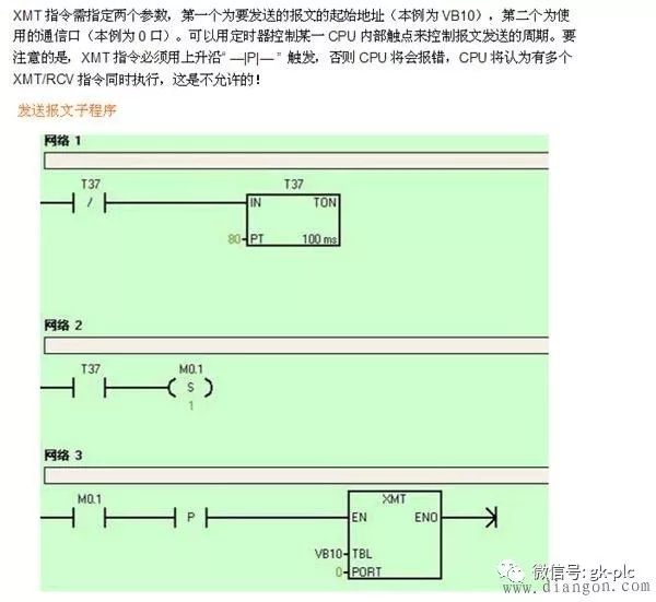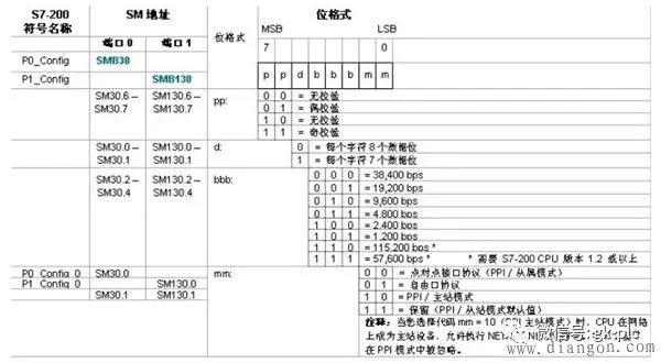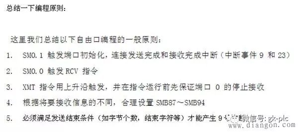S7-200CPU上的通信口在电气上是标准的RS-485半双工串行通信口。此串行字符通信的格式可以包括: 一个起始位 7或8位字符(数据字节) 一个奇/偶校验位,或者没有校验位 自由口通信速波特率可以设置为1200、2400、4800、9600、19200、38400、57600或112500。 凡是符合这些格式的串行通信设备,理论上都可以和S7-200CPU通信。 自由口模式可以灵活应用。Micro/WIN的两个指令库(USS和ModbusRTU)就是使用自由口模式编程实现的。 在进行自由口通信程序调试时,可以使用PC/PPI电缆(设置到自由口通信模式)连接PC和CPU,在PC上运行串口调试软件(或者Windows的HyperTerminal-超级终端)调试自由口程序。 USB/PPI电缆和CP卡不支持自由口调试。 自由口通信要点 应用自由口通信首先要把通信口定义为自由口模式,同时设置相应的通信波特率和上述通信格式。用户程序通过特殊存储器SMB30(对端口0)、SMB130(对端口1)控制通信口的工作模式。详见下图 CPU通信口工作在自由口模式时,通信口就不支持其他通信协议(比如PPI),此通信口不能再与编程软件Micro/WIN通信。CPU停止时,自由口不能工作,Micro/WIN就可以与CPU通信。 通信口的工作模式,是可以在运行过程中由用户程序重复定义的。 如果调试时需要在自由口模式与PPI模式之间切换,可以使用SM0.7的状态决定通信口的模式;而SM0.7的状态反映的是CPU运行状态开关的位置(在RUN时SM0.7="1",在STOP时SM0.7="0") 自由口通信的核心指令是发送(XMT)和接收(RCV)指令。在自由口通信常用的中断有“接收指令结束中断”、“发送指令结束中断”,以及通信端口缓冲区接收中断。 与网络读写指令(NetR/NetW)类似,用户程序不能直接控制通信芯片而必须通过操作系统。用户程序使用通信数据缓冲区和特殊存储器与操作系统交换相关的信息。 XMT和RCV指令的数据缓冲区类似,起始字节为需要发送的或接收的字符个数,随后是数据字节本身。如果接收的消息中包括了起始或结束字符,则它们也算数据字节。 调用XMT和RCV指令时只需要指定通信口和数据缓冲区的起始字节地址。 XMT和RCV指令与NetW/NetR指令不同的是,它们与网络上通信对象的“地址”无关,而仅对本地的通信端口操作。如果网络上有多个设备,消息中必然包含地址信息;这些包含地址信息的消息才是XMT和RCV指令的处理对象。 由于S7-200的通信端口是半双工RS-485芯片,XMT指令和RCV指令不能同时有效。 XMT和RCV指令 XMT(发送)指令的使用比较简单。RCV(接收)指令所需要的控制稍多一些。 RCV指令的基本工作过程为: 在逻辑条件满足时,启动(一次)RCV指令,进入接收等待状态 监视通信端口,等待设置的消息起始条件满足,然后进入消息接收状态 如果满足了设置的消息结束条件,则结束消息,然后退出接收状态 所以,RCV指令启动后并不一定就接收消息,如果没有让它开始消息接收的条件,就一直处于等待接收的状态;如果消息始终没有开始或者结束,通信口就一直处于接收状态。这时如果尝试执行XMT指令,就不会发送任何消息。 所以确保不同时执行XMT和RCV非常重要,可以使用发送完成中断和接收完成中断功能,在中断程序中启动另一个指令。 在《S7-200系统手册》和Micro/WIN在线帮助中关于XMT和RCV指令的使用有一个例子。这个例子非常经典,强烈建议学习自由口通信时先做通这个例子。例程,见下图