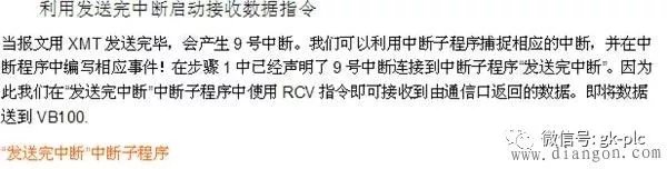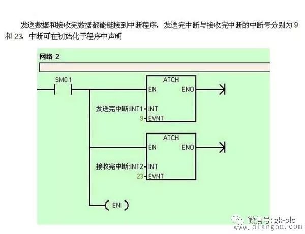 字符接收中断 S7-200CPU提供了通信口字符接收中断功能,通信口接收到字符时会产生一个中断,接收到的字符暂存在特殊存储器SMB2中。通信口Port0和Port1共用SMB2,但两个口的字符接收中断号不同。 每接收到一个字符,就会产生一次中断。对于连续发送消息,需要在中断服务程序中将单个的字符排列到用户规定的消息保存区域中。实现这个功能可能使用间接寻址比较好。 对于高通信速率来说,字符中断接受方式需要中断程序的执行速度足够快。 一般情况下,使用结束字符作为RCV指令的结束条件比较可靠。如果通信对象的消息帧中以一个不定的字符(字节)结束(如校验码等),就应当规定消息或字符超时作为结束RCV指令的条件。但是往往通信对象未必具有严格的协议规定、工作也未必可靠,这就可能造成RCV指令不能正常结束。这种情况下可以使用字符接收中断功能。如下图