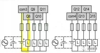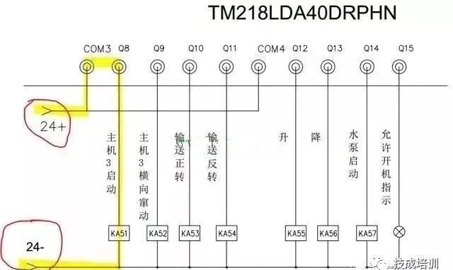 如图所示,这是实际的接线,红色圆圈部分是外接的电源,而黄色荧光笔部分就是Q8这个输出点的回路。电流从右侧24+端子流入COM3,当Q8有输出的时候,COM3和Q8导通,驱动继电器,而主机3就会启动,所以,PLC 的输出其实就是导通了输出点和COM端。同理 Q9 有输出就是导通了COM端和Q9, Q12有输出就是导通了COM4和Q12。需要注意的是,PLC的输出端不止有一个公共端COM,一定要区分使用。