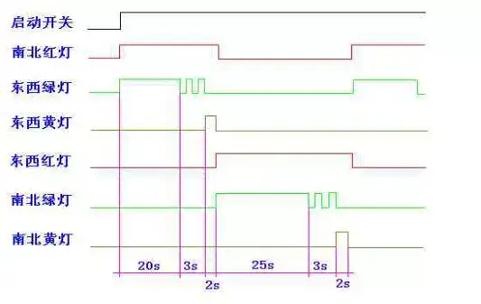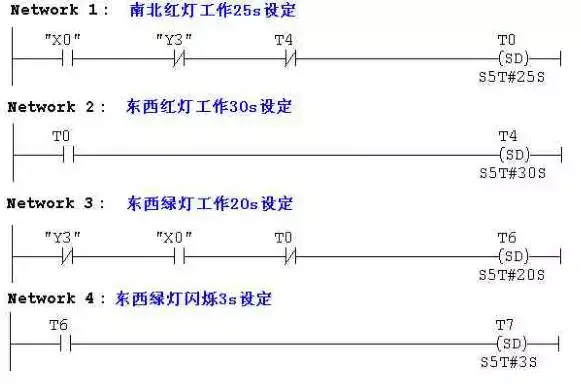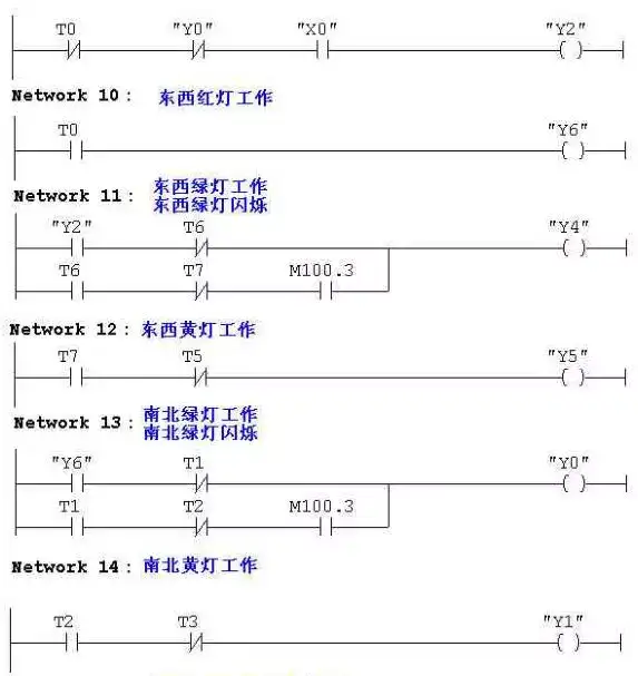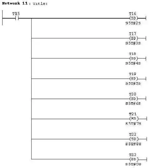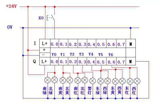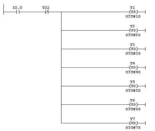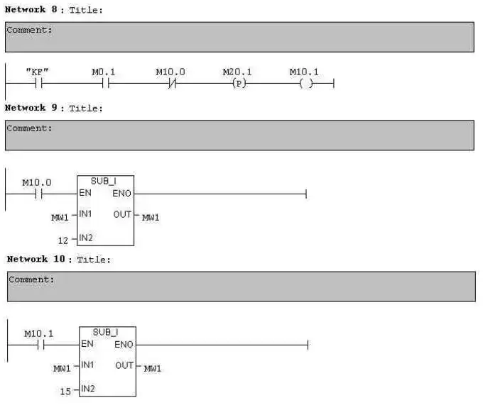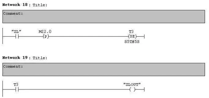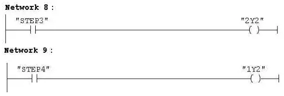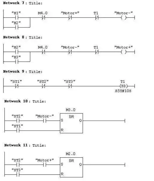 ![]() 十字路口的交通指挥信号灯布置如下图: ![]() 一、控制要求 (1)信号灯系统由一个启动开关控制,当启动开关接通时,该信号灯系 统开始工作,当启动开关关断时,所有信号灯都熄灭。 (2)南北绿灯和东西绿灯不能同时亮。如果同时亮应关闭信号灯系统, 并立刻报警。 (3)南北红灯亮维持 25s。在南北红灯亮的同时东西绿灯也亮,并维持 20s。到 20s 时,东西绿灯闪亮,闪亮 3s 后熄灭,此时,东西黄 灯亮,并维持 2s。到 2s 时,东西黄灯熄灭,东西红灯亮。同时, 南北红灯熄灭,南北绿灯亮。 (4)东西红灯亮维持 30s。南北绿灯亮维持 25s,然后闪亮 3s 后熄灭。 同时南北黄灯亮,维持 2s 后熄灭,这时南北红灯亮,东西绿灯亮。 (5)以上南北、东西信号灯周而复始地交替工作状态,指挥着十字路口 的交通,其时序如下所示。 ![]() ![]() 二、PLC 接线 ![]() 三、定义符号地址 ![]() 四、梯形图程序 ![]() ![]() ![]() ![]() 如下所示是三层楼电梯示意图。电梯的上升、下降由一台电动机控制;正 转时电梯上升、反转时电梯下降。各层设一个呼叫开关(SB1、SB2、SB3)、 一个呼叫指示灯(H1、H2、H3)、一个到位行程开关(ST1、ST2、ST3)。 ![]() 控制要求: (1)各层的呼叫开关为按钮式开关,SB1、SB2 及 SB3 均为瞬间接通有效 (即瞬间接通的即放开仍有效)。 (2)电梯箱体上升途中只响应上升呼叫,下降途中只响应下降呼叫,任何 反方向呼叫均无效,简称为不可逆响应。具体动作要求,如下表。 (3)各楼层间有效运行时间应小于 10S,否则认为有故障、自动令电动机停转。 ![]() ![]() ![]() ![]() ![]() 多种液体自动混合装置的 PLC 控制 如图所示为三种液体混合装置,SQ1、SQ2、SQ3 和 SQ4 为液面传感器, 液面淹没时接通,液体 A、B、C 与混合液阀由电磁阀 YV1、YV2、YV3、 YV4 控制,M 为搅匀电动机,其控制要求如下: ![]() 1.初始状态 装置投入运行时,液体 A、B、C 阀门关闭,混合液阀门打开 20s 将容 器放空后关闭。 2.起动操作 按下启动按钮 SB1,装置开始按下列给定规律运转: ①液体 A 阀门打开,液体 A 流入容器。当液面达到 SQ3 时,SQ3 按通, 关闭液体 A 阀门,打开液体 B 阀门。 ②当液面达到 SQ2 时,关闭液体 B 阀门,打开液体 C 阀门。 ③当液面达到 SQ1 时,关闭液体 C 阀门,搅匀电动机开始搅拌。 ④搅匀电动机工作 1min 后停止搅动,混合液体阀门打开,开始放出 混合液体。 ⑤当液面下降到 SQ4 时,SQ4 由接通变断开,再过 20s 后,容器放空, 混合液阀门关闭,开始下一周期。 3.停止操作 按下停止按钮 SB2 后,要将当前的混合操作处理完毕后,才停止操 作(停在初始状态) 参考程序: ![]() ![]() ![]() 霓虹灯广告屏控制器的设计 用 PLC 对霓虹灯广告屏实现控制,其具体要求如下: ![]() 该广告屏中间 8 个灯管亮灭的时序为第 1 根亮→第 2 根亮→第 3 根 亮→…→第 8 根亮,时间间隔为 1s,全亮后,显示 10s,再反过来从 8→7→…→1 顺序熄灭。全灭后,停亮 2s,再从第 8 根灯管开始亮 起,顺序点亮 7→6→…→1,时间间隔为 1s,显示 20s,再从→2→…→8 顺序熄灭。全熄灭后,停亮 2s,再从头开始运行,周而复始。 参考梯形图程序: ![]() ![]() ![]() ![]() ![]() ![]() ![]() 设计程序,使两个气缸顺序动作,其顺序为:A1B1B0A0。 (一)气控回路 ![]() (二)位移-步骤图 ![]() (三)I 型障碍信号分析 ![]() (四)PLC 接线 ![]() (五)定义符号地址 ![]() (六)梯形图程序 ![]() ![]() ![]() 自动售货机的 PLC 控制 如下图所示的自动售货机示意图,其工作要求如下: ![]() 1.此售货机可投入 1 元、5 元或 10 元硬币。 2.当投入的硬币总值超过 12 元时,汽水按钮指示灯亮;当投入的硬 币总值超过 15 元时,汽水及咖啡按钮指示灯都亮。 3.当汽水按钮灯亮时,按汽水按钮,则汽水排出 7s 后自动停止,这段时间内,汽水指示灯闪动。 4.当咖啡按钮灯亮时,按咖啡按钮,则咖啡排出 7s 后自动停止,这段时间内,咖啡指示灯闪动。 5.若投入硬币总值超过按钮所需的钱数(汽水 12 元,咖啡 15 元)时,找钱指示灯亮,表示找钱动作,并退出多余的钱。 参考答案: ![]() ![]() ![]() ![]() ![]() ![]() ![]() ![]() |