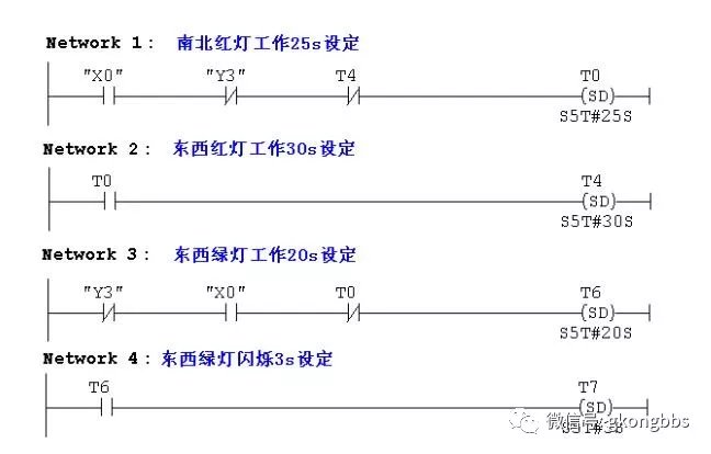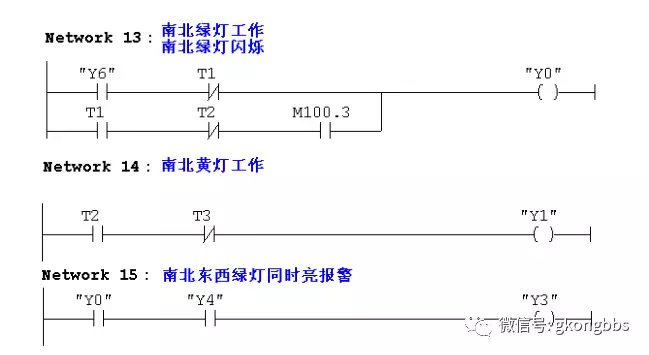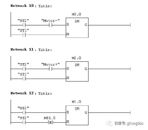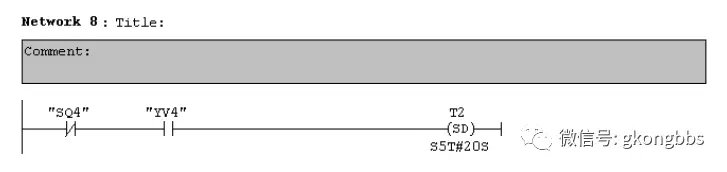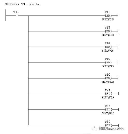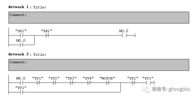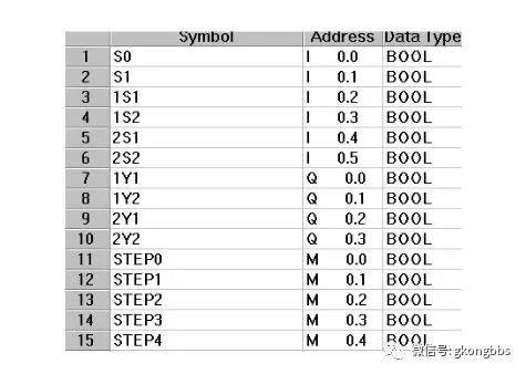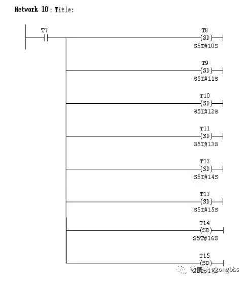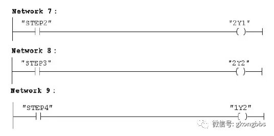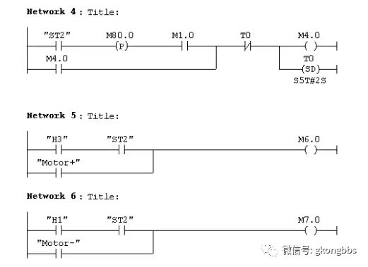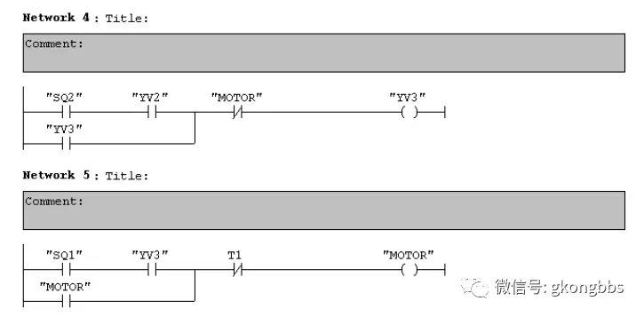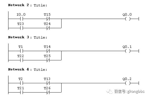 十字路口的交通指挥信号灯布置如下图: ![]() 一、控制要求 (1)信号灯系统由一个启动开关控制,当启动开关接通时,该信号灯系 统开始工作,当启动开关关断时,所有信号灯都熄灭。 (2)南北绿灯和东西绿灯不能同时亮。如果同时亮应关闭信号灯系统, 并立刻报警。 (3)南北红灯亮维持 25s。在南北红灯亮的同时东西绿灯也亮,并维持 20s。到 20s 时,东西绿灯闪亮,闪亮 3s 后熄灭,此时,东西黄 灯亮,并维持 2s。到 2s 时,东西黄灯熄灭,东西红灯亮。同时, 南北红灯熄灭,南北绿灯亮。 (4)东西红灯亮维持 30s。南北绿灯亮维持 25s,然后闪亮 3s 后熄灭。 同时南北黄灯亮,维持 2s 后熄灭,这时南北红灯亮,东西绿灯亮。 (5)以上南北、东西信号灯周而复始地交替工作状态,指挥着十字路口 的交通,其时序如下所示。 ![]() ![]() 二、PLC 接线 ![]() ![]() 三、定义符号地址 ![]() 四、梯形图程序 ![]() ![]() ![]() 如下所示是三层楼电梯示意图。电梯的上升、下降由一台电动机控制;正 转时电梯上升、反转时电梯下降。各层设一个呼叫开关(SB1、SB2、SB3)、 一个呼叫指示灯(H1、H2、H3)、一个到位行程开关(ST1、ST2、ST3)。 ![]() 控制要求: (1)各层的呼叫开关为按钮式开关,SB1、SB2 及 SB3 均为瞬间接通有效 (即瞬间接通的即放开仍有效)。 (2)电梯箱体上升途中只响应上升呼叫,下降途中只响应下降呼叫,任何 反方向呼叫均无效,简称为不可逆响应。具体动作要求,如下表。 (3)各楼层间有效运行时间应小于 10S,否则认为有故障、自动令电动机停转。 ![]() ![]() ![]() ![]() ![]() ![]() 多种液体自动混合装置的 PLC 控制 如图所示为三种液体混合装置,SQ1、SQ2、SQ3 和 SQ4 为液面传感器, 液面淹没时接通,液体 A、B、C 与混合液阀由电磁阀 YV1、YV2、YV3、 YV4 控制,M 为搅匀电动机,其控制要求如下: ![]() 1.初始状态 装置投入运行时,液体 A、B、C 阀门关闭,混合液阀门打开 20s 将容 器放空后关闭。 2.起动操作 按下启动按钮 SB1,装置开始按下列给定规律运转: ①液体 A 阀门打开,液体 A 流入容器。当液面达到 SQ3 时,SQ3 按通, 关闭液体 A 阀门,打开液体 B 阀门。 ②当液面达到 SQ2 时,关闭液体 B 阀门,打开液体 C 阀门。 ③当液面达到 SQ1 时,关闭液体 C 阀门,搅匀电动机开始搅拌。 ④搅匀电动机工作 1min 后停止搅动,混合液体阀门打开,开始放出 混合液体。 ⑤当液面下降到 SQ4 时,SQ4 由接通变断开,再过 20s 后,容器放空, 混合液阀门关闭,开始下一周期。 3.停止操作 按下停止按钮 SB2 后,要将当前的混合操作处理完毕后,才停止操 作(停在初始状态) 参考程序: ![]() ![]() ![]() ![]() ![]() 霓虹灯广告屏控制器的设计 用 PLC 对霓虹灯广告屏实现控制,其具体要求如下: ![]() 该广告屏中间 8 个灯管亮灭的时序为第 1 根亮→第 2 根亮→第 3 根 亮→…→第 8 根亮,时间间隔为 1s,全亮后,显示 10s,再反过来从 8→7→…→1 顺序熄灭。全灭后,停亮 2s,再从第 8 根灯管开始亮 起,顺序点亮 7→6→…→1,时间间隔为 1s,显示 20s,再从→2→…→8 顺序熄灭。全熄灭后,停亮 2s,再从头开始运行,周而复始。 参考梯形图程序: ![]() ![]() ![]() ![]() ![]() ![]() ![]() ![]() 设计程序,使两个气缸顺序动作,其顺序为:A1B1B0A0。 (一)气控回路 (二)位移-步骤图 (三)I 型障碍信号分析 ![]() (四)PLC 接线 ![]() (五)定义符号地址 ![]() (六)梯形图程序 ![]() ![]() 自动售货机的 PLC 控制 如下图所示的自动售货机示意图,其工作要求如下: ![]() 1.此售货机可投入 1 元、5 元或 10 元硬币。 2.当投入的硬币总值超过 12 元时,汽水按钮指示灯亮;当投入的硬 币总值超过 15 元时,汽水及咖啡按钮指示灯都亮。 3.当汽水按钮灯亮时,按汽水按钮,则汽水排出 7s 后自动停止,这段时间内,汽水指示灯闪动。 4.当咖啡按钮灯亮时,按咖啡按钮,则咖啡排出 7s 后自动停止,这段时间内,咖啡指示灯闪动。 5.若投入硬币总值超过按钮所需的钱数(汽水 12 元,咖啡 15 元)时,找钱指示灯亮,表示找钱动作,并退出多余的钱。 参考答案: ![]() ![]() ![]() ![]() ![]() ![]() ![]() ![]() ![]() ![]() |