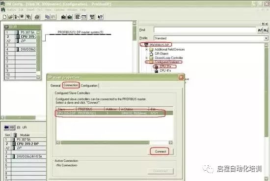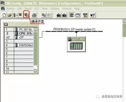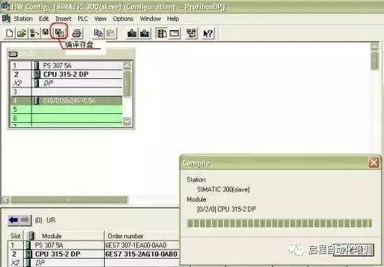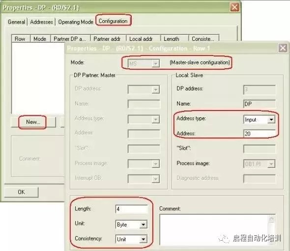 1. PROFIBUS 基本性质 PROFIBUS规定了串行现场总线系统的技术和功能特性。通过这个系统,从底层(传感器、执行器级)到中层(单元级)的分布式、数字现场可编程控制器都可以连网。PROFIBUS区分为主站和从站。 > 主站 主站掌握总线中数据流的控制权。只要它拥有访问总线权(令牌),主站就可在没有外部请求的情况下发送信息。在PROFIBUS协议中,主站也被称作主动节点。 > 从站 从站是简单的输入、输出设备。典型的从站为传感器,执行器以及变频器。从站也可为智能从站,如S7300/400带集成口的CPU等。从站不 会拥有总线访问的授权。从站只能确认收到的信息或者在主站的请求下发送信息。从站也被称作被动节点。 > 传输方法 符合美国标准EIA RS485的闭合电路传输,是制造工程、建筑服务管理 系统和动力工程的基本标准。它采用铜导体的双绞线,也可用光纤。 > 传输速度 PROFIBUS总线的传输速率从9.6Kbit/s—12Mbit/s。 网段总线长度与传输速率的关系 > 最大节点数 127(地址0-126)2. ROFIBUS现场应用类型 PROFIBUS提供了三种通信协议类型:FMS,DP和PA > PROFIBUS-FMS: 用于现场通用通信任务的FMS接口(DIN 19245 T.2) > PROFIBUS-DP: 用于与分布式I/O进行高速通讯 > PROFIBUS-PA: 用于执行规定现场设备特性的PA设备,它使用扩展的PROFIBUS-DP协议进行数据传输。 3. 利用PROFIBUS DP进行的通信 PROFIBUS-DP是为了实现在传感器-执行器级快速数据交换而设计的。中央控制装置(例如可编程控制器)在这里通过一种快速的串行接口与分布式输入和输出设备通信。与这些装置的通信一般是循环发生的。 中央控制器(主站)从从站读取输入信息并将输出信息写到从站。 单主站或者多主站系统可以由PROFIBUS-DP来实现。这使得系统配置异常方便。一条总线最多可以连接126个设备(主站或从站)。 > 系统配置 系统配置的规范包含一系列的站点,I/O地址的分配, 输入输出数据的完整性,诊断信息的格式以及总线参数。 > 设备类型 DP1类主站 这是一种在给定的信息循环中与分布式站点(DP从站)交换信息 的中央控制器。 典型的设备有: 可编程控制器(PLC),微机数值控制(CNC)或计算机(PC) 等。 DP2类主站 属于这一类的装置包括编程器,组态装置和诊断装置,例如上位 机。这些设备在DP系统初始化时用来生成系统配置。 DP从站 一台DP从站是一种对过程读和写信息的输入、输出装置(传感器/ 执行器),例如分布式I/O,ET200,变频器等。 通过PROFIBUS-DP实现两CPU集成DP接口之间的主从通信 PROFIBUS-DP从站不仅仅是ET200系列的远程I/O站,当然也可以是一些智能从站,如带集成DP接口和PROFIBUS 通信模块的S7 300站,S7400站(V3.0以上)都可以作为DP的从站。下面我们将以两个CPU315-2DP CPU之间主从通信为例介绍连接智能从站的组态方法。 1. 硬件和软件需求 硬件: PROFIBUS-DP主站 S7-300 CPU315-2DP(6ES7 315-2AG10-0AB0),SM374 PROFIBUS-DP从站 S7-300 CPU315-2DP(6ES7 315-2AG10-0AB0);SM374 PROFIBUS电缆及接头 CP5512(PCMCIA卡,用于笔记本电脑)或PC适配器,CP5611(PC机) 软件: STEP7 V5.3 SP2 2. 网络组态及参数设置 1) 新建项目: 在STEP7中创建一个新项目,然后选择Insert ® Station ® Simatic 300 station,插入两个S7 300站,这里命名为Simatic 300(master)和 Simatic 300(slave)。当然也可完成一个站的配置后,再建另一个。如图1。 ![]() 图1 在STEP7 硬件组态中插入两个S7 300站 2) 组态从站:在两CPU主从通信组态配置是,原则上要先组态从站。 > 硬件组态 双击Simatic 300(slave)“Hardware”,进入硬件组态窗口,在功能按钮栏中点击“Catalog”图标打开硬件目录,按硬件安装次序和订货号依次插入机架、电源、CPU和SM374等进行硬件组态。 插入CPU时会同时弹出PROFIBUS接口组态窗口。也可以插入CPU后,双击DP(X2)插槽,打开DP属性窗口点击属性按钮进入PROFIBUS接口组态窗口。点击“NEW”按钮新建PROFIBUS网络,分配 PROFIBUS站地址,本例设为3号站。点击“Propertives”按钮组态网络属性,选择“Network Setting”进行网络参数设置,如波特率、行规。本例传输速率为1.5Mbit/s,行规为DP。如图2。 ![]() 图2 Profibus DP 网络参数设置 确认上述设置后,PROFIBUS接口状态如图3。 ![]() 图3 Profibus 接口状态 > DP 模式选择 同样在DP属性设置对话框中,选择“Operating Mode”标签,激活“DP slave”操作模式。如果“Test,commissioning,routing”选项被激活,则意味着这个接口既可以作为DP从站,同时还可以通过这个接口监控程序。也可以用STEP7 F1帮助功能查看详细信息。 ![]() 图4 DP 模式选择 > 定义从站通信接口区 选择“Configuration”标签,打开I/O通信接口区属性设置窗口,点击“New”按钮新建一行通信接口区,如图5可以看到当前组态模式为主从(MS,Master-slave configuration)。注意此时只能对本地(从站)进行通信数据区的配置。 Address type: 选择“Input”对应输入区,“Output”对应输出区。 Address: 设置通信数据区的起地址。 Length: 设置通信区域的大小,最多32字节。 Unit: 选择是按字节(byte)还是按字(word)来通信。 Consistency: 选择“Unit”是按在“Unit”中定义的数据格式发送,即按字节或字发送; 若选择“All”表示是打包发送,每包最多32字节。此时通信数据大于4个 字节时,应用SFC14,SFC15。 设置完成后点击“Apply”按钮确认。同样可根据实际通信数据建立若干行,但最大不能超过244字节。在本例中分别创建一个输入区和一个输出区,长度为4字节,设置完成后可在“Configuration”窗口中看到这两个通信接口区。如图6。 ![]() 
