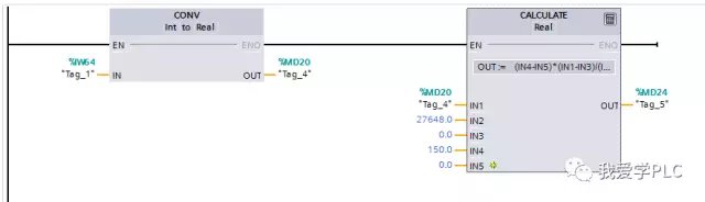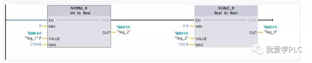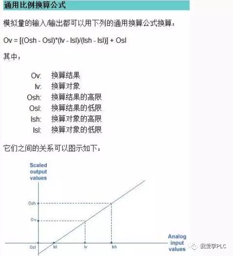 前几天有个朋友问了个有关于S7-1200PLC中的模拟量的转换问题,他跟我说S7-300中有FC105和FC106用于做模拟量的转换过程,S7-200 中也有scaling转换库指令,可以用于模拟的转换。但在S7-1200中为什么就没有相应的库去做转换呢? 对于S7-1200的PLC来讲,并没有S7-300中使用到的FC105和FC106这两个块的,但是做法有要几种,这里跟大家说两种方法: (方法一)S7-1200中提供了两条指令供大家使用,大家在使用者两条指令时,就可以用于完成模拟量的转换过程。(1)NORM_X:标准化 (2)SCALE_X:缩放 (1)NORM_X:标准化 “标准化”指令,通过将输入 VALUE 中变量的值映射到线性标尺对其进行标准化。 可以使用参数 MIN 和 MAX 定义范围的限值。 输出 OUT 中的结果经过计算并存储为浮点数,这取决于要标准化的值在该值范围中的位置。 如果要标准化的值等于输入 MIN 中的值,则输出 OUT 将返回值“0.0”。 如果要标准化的值等于输入 MAX 的值,则输出 OUT 需返回值“1.0”。如果是用于模拟量的转换,则MIN和MAX表示的就是我们模拟量模块输入信号对应的数字量的范围,而VALUE表示的就是我们的模拟量模块的采用值。如下图所示: ![]() (2)SCALE_X:缩放 “缩放”指令,通过将输入 VALUE 的值映射到指定的值范围来对其进行缩放。 当执行“缩放”指令时,输入 VALUE 的浮点值会缩放到由参数 MIN 和 MAX 定义的值范围。 缩放结果为整数,存储在 OUT 输出中。 ![]() 所以通过这两个指令,我们就可以实现模拟量的转换过程。如下图所示: ![]() (方法二) 可以自己通过转换指令(CONVERT)及数学函数中的计算指令(CALCULATE),按照模拟量的转换公式编写这个计算指令。 ![]() 模拟量转换公式: ![]() 编写计算公式时,首先定义好各个管脚所对应的公式中的名称, IV:IN1 Ish:IN2 Isl:IN3 Osh:IN4 Osl:IN5 OV:OUT ![]() 在生产的指令上面输入相应的参数即可: ![]() 当然在会用的过程中,也可以直接使用带参数的FC按照模拟量的转换公式去编写相应的程序。 若有不对之处请指正,谢谢 ![]() |