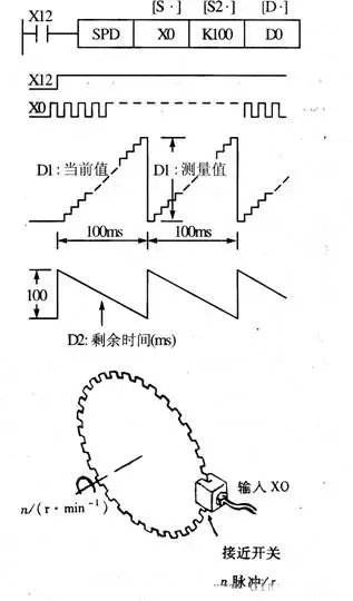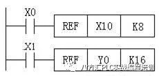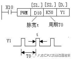 1和输入输出有关的指令 (1)输入输出刷新指令REF REF(P)指令的编号为FNC50。三菱FX系列PLC采用集中输入输出的方式。如果需要最新的输入信息以及希望立即输出结果则必须使用该指令。如图1所示,当X0接通时,X10~X17共8点将被刷新;当X1接通时,则Y0~Y7、Y10~Y17、共16点输出将被刷新。 ![]() 三菱PLC高速处理指令 图1 输入输出刷新指令的使用 使用REF指令时应注意: 1)目标操作数为元件编号个位为0的X和Y,n应为8的整倍数。 2)指令只要进行16位运算,占5个程序步。 (2)滤波调整指令REFF REFF(P)指令的编号为FNC51。在FX系列PLC中X0~X17使用了数字滤波器,用REFF指令可调节其滤波时间,范围为0~60ms(实际上由于输入端有RL滤波,所以最小滤波时间为50μs)。如图2所示,当X0接通时,执行REFF指令,滤波时间常数被设定为1ms。 ![]() 三菱PLC高速处理指令 图2 滤波调整指令说明 使用REFF指令时应注意: 1)REFF为16位运算指令,占7个程序步。 2)当X0~X7用作高速计数输入时或使用FNC56速度检测指令以及中断输入时,输入滤波器的滤波时间自动设置为50ms。 (3)矩阵输入指令MTR MTR指令的编号为FNC52。利用MTR可以构成连续排列的8点输入与n点输出组成的8列n行的输入矩阵。如图3所示,由[S]指定的输入X0~X7共8点与n点输出Y0、Y1、Y2(n=3)组成一个输入矩阵。PLC在运行时执行MTR指令,当Y0为ON时,读入第一行的输入数据,存入M30~M37中;Y1为ON时读入第二行的输入状态,存入M40~M47。其余类推,反复执行。 三菱PLC高速处理指令 图3 矩阵输入指令的使用 使用MTR指令时应注意: 1)源操作数[S]是元件编号个位为0的X,目标操作数[D1] 是元件编号个位为0的Y,目标操作数[D2] 是元件编号个位为0的Y、M和S,n的取值范围是2~8。 2)考虑到输入滤波应答延迟为10ms,对于每一个输出按20ms顺序中断,立即执行。 3)利用本指令通过8点晶体管输出获得64点输入,但读一次64点输入所许时间为20ms×8=160ms,不适应高速输入操作。 4)该指令只有16位运算,占9个程序步。 2高速计数器指令 (1)高速计数器置位指令HSCS DHSCS指令的编号为FNC53。它应用于高速计数器的置位,使计数器的当前值达到预置值时,计数器的输出触点立即动作。它采用了中断方式使置位和输出立即执行而与扫描周期无关。如图4所示,[S1.]为设定值(100),当高速计数器C255的当前值由99变100或由101变为100时,Y0都将立即置1。 三菱PLC高速处理指令 图4 高速计数器指令的使用 (2)高速计速器比较复位指令HSCR DHSCR指令的编号为FNC54。如图3-63所示,C254的当前值由199变为200或由201变为200时,则用中断的方式使Y10立即复位。 使用HSCS和HSCR时应注意: 1)源操作数[S1.]可取所有数据类型,[S2.]为C235~C255,目标操作数可取Y、M和S。 2)只有32位运算,占13个程序步。 (3)高速计速器区间比较指令HSZ DHSZ指令的编号为FNC55。如图3-63所示,目标操作数为Y20、Y21和Y22。如果C251的当前值K1200时,Y22为ON。 使用高速计速器区间比较指令时应注意: 1)操作数[S1.] 、[S2.]可取所有数据类型,[S .]为C235~C255,目标操作数[D.]可取Y、M、S。 2)指令为32位操作,占17个程序步。 3速度检测指令 速度检测指令SPD的编号为FNC56。它的功能是用来检测给定时间内从编码器输入的脉冲个数,并计算出速度。如图5所示,[D. ]占三个目标元件。当X12为ON时,用D1对X0的输入上升沿计数,100ms后计数结果送入D0,D1复位,D1重新开始对X0计数。D2在计数结束后计算剩余时间。 ![]() 三菱PLC高速处理指令 图5 速度检测指令的使用 使用速度检测指令时应注意: 1)[S1.]为X0~X5,[S2.]可取所有的数据类型,[D.]可以是T、C、D、V和Z。 2)指令只有16位操作,占7个程序步。 4脉冲输出指令 三菱PLC脉冲输出指令(D)PLSY的编号为FNC57。它用来产生指定数量的脉冲。如图6所示,[S1.]用来指定脉冲频率(2~20000Hz),[S2.]指定脉冲的个数(16位指令的范围为1~32767, 32位指令则为1~2147483647)。如果指定脉冲数为0,则产生无穷多个脉冲。[D .]用来指定脉冲输出元件号。脉冲的占空比为50%,脉冲以中断方式输出。指定脉冲输出完后,完成标志M8029置1。X10由ON变为OFF时,M8029复位,停止输出脉冲。若X10再次变为ON则脉冲从头开始输出。 三菱PLC高速处理指令 图6 脉冲输出指令的使用 使用脉冲输出指令时应注意: 1)[S1.]、[S2.]可取所有的数据类型,[D.]为Y1和Y2。 2)该指令可进行16和32位操作,分别占用7个和13个程序步。 3)本指令在程序中只能使用一次。 5脉宽调制指令 脉宽调制指令PWM的编号为FNC58。它的功能是用来产生指定脉冲宽度和周期的脉冲串。如图7所示,[S1.] 用来指定脉冲的宽度,[S2.]用来指定脉冲的周期,[D.]用来指定输出脉冲的元件号(Y0或Y1),输出的ON/OFF状态由中断方式控制。 ![]() 三菱PLC高速处理指令 图7 脉宽调制指令的使用 使用1)操作数的类型与PLSY相同;该指令只有16位操作,需7个程序步。 2)[S1.]应小于[S2.]。 6可调速脉冲输出指令 可调速脉冲输出指令该指令(D)PLSR的编号为FNC59。该指令可以对输出脉冲进行加速,也可进行减速调整。源操作数和目标操作数的类型和PLSY指令相同,只能用于晶体管PLC的Y0和Y1,可进行16位操作也可进行32位操作,分别占9个和17个程序步。该指令只能用一次。 |