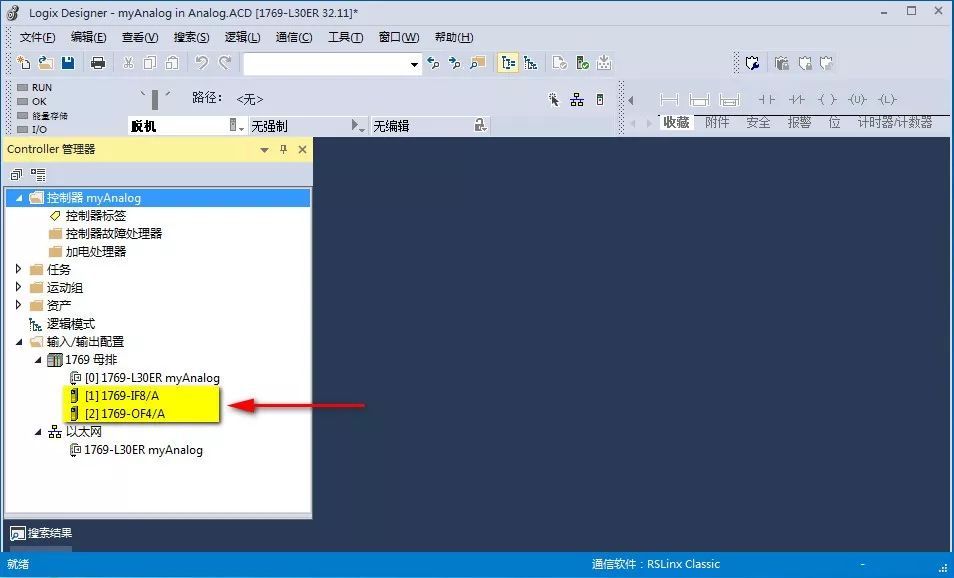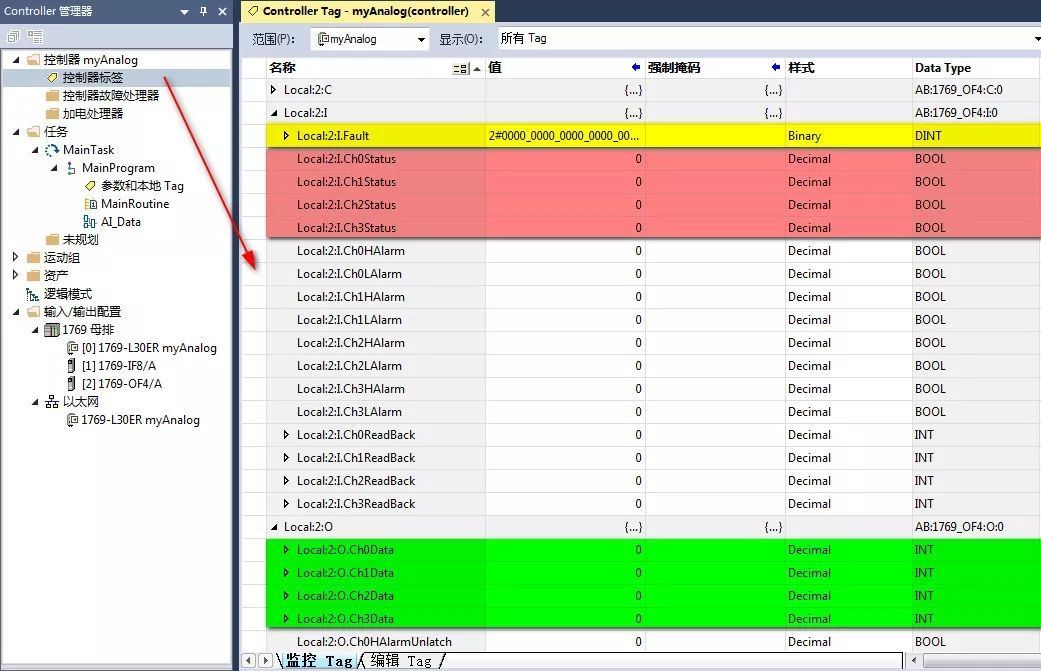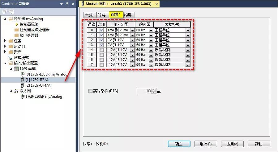 01 测试环境 1. 操作系统:Windows7 旗舰版 SP1 64位 3. 硬件平台:1769-L30ER + IF8 + OF4 02 情景设定 1. 使用模拟量输入模块1769-IF8,采集超声波液位LT101实时数据. 2. 使用模拟量输出模块1769-OF4,调节变频器Invt101频率. 3. 打开Studio 5000 V32中文版本,新建一个项目,CPU型号为1769-L30ER,AI模块为1769-IF8,AO模块型号为1769-OF4. ![]() 03 模拟量输入模块 (1769-IF8) 1. 1769-IF8硬件概述