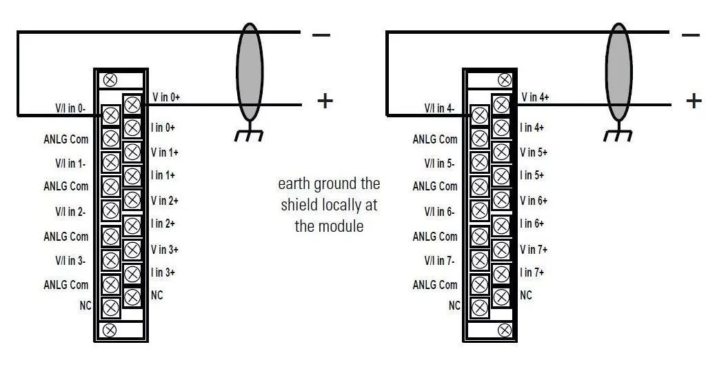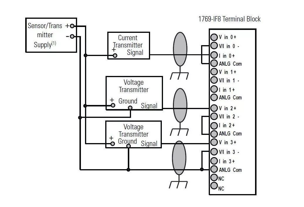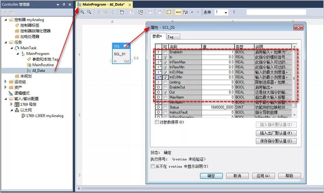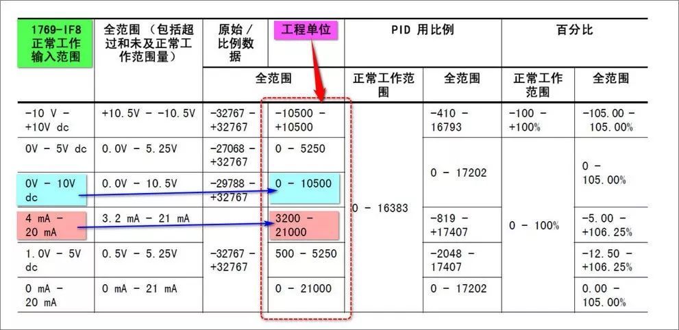 ![]() 2. 硬件接线,有两种. 1) 差分接线方式:信号直接接入通道的信号正、信号负端子,公共端不用接,这样就产生了信号正相对信号负的信号源,这种方式适用于无需接地的情形,可以最大程度抗干扰. ![]() ![]() 3. 组态配置,双击1769-IF8模块,进入配置页面,如果哪个通道需要接入设备或仪表,选择启用;输入范围由传感器设备信号源决定,比如4-20mA;滤波器一般默认即可;数据格式有4种,通常选择工程单位. ![]() 4. 组态配置后,在控制器标签里面自动生成该模块的IO标签,由于是模拟量输入模块,主要的信息和数据在Local:1:I里面,其中: 1) Local:1:I:Fault,如果为0,表示控制器与模块连接正常,否则表示连接出现故障; 2) Local:1:I:Ch0Data -- Ch7Data:表示通道0 - 通道7电信号原始数据; 3) Local:1:I:Ch0Status -- Ch7Status:表示通道0 - 通道7状态. ![]() 5. 重要诊断信息 1) 工作范围检测,比如:某仪表接入通道0,且配置工作范围在4-20mA,当通道0接收的信号大于20mA,就会产生超过范围错误,这时,Local:1:I:Ch0OverRange就会置1;当通道0接收的信号小于4mA,就会产生未及范围错误,这时,Local:1:I:Ch0UnderRange就会置1; 2) 开路检测,如果信号源为 4 - 20 mA ,且配置为启用,那么通道就会执行开路检测。如果出现开路情况,该通道的未及范围位(Local:1:I:Ch0UnderRange)就会置1,造成开路情况的原因有:传感设备连接断开、电缆松脱或断开、传感设备没有安装在所配置的通道上. ![]() 6. 信号源数据转换,传感器设备信号源为电压或电流,模拟量模块需要将其转换为控制器识别的数字信号,再用指令将数字信号进行处理,得出仪表或设备的实时数据。常用的输入数据转换格式有:原始/比例数据、工程单位、PID用比例,百分比。下图为1769-IF8正常工作范围的数据转换表,例如:信号源为4-20mA,输入数据格式为工程单位,那么4mA对应的数值为3200;20mA对应的数值为21000. ![]() 7. 使用SCL(标定)指令将信号源数据转换为传感器设备测量的实时值。比如:超声波液位计LT101,信号源为4-20mA,量程范围为0.0 -- 15.0m,接入1769-IF8的第0通道,通过编程采集实时液位值。在Studio 5000新建一个使用FBD语言编程的子例程AI_Data,调用SCL指令,其参数配置如下图: ![]() 8. 模拟量输入模块数据处理,SCL指令详解: