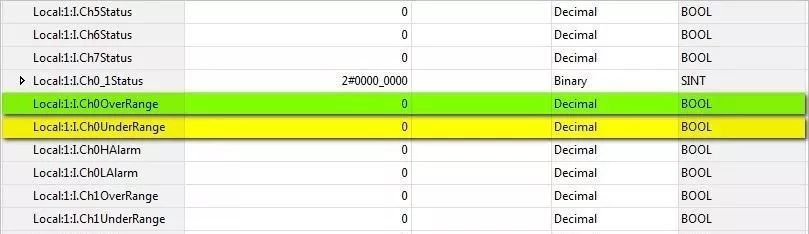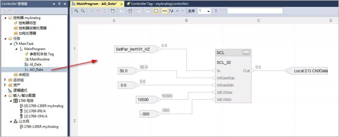 ![]() 2. 硬件接线,采用单端接线方式:传感器设备信号正极接入通道的信号正端子,信号负极与模块信号地连接,要求使用屏蔽电缆,且屏蔽线在控制柜单端接地. ![]() 3. 组态配置,双击1769-OF4模块,进入配置页面,选择启用通道;输出范围由设备信号源决定,比如4-20mA或0-10V;数据格式有4种,通常选择工程单位。然后配置通道输出限制在数据范围之内. ![]() 4. 组态配置后,在控制器标签里面自动生成该模块的IO标签,主要的信息和数据都能监控,其中: 1) Local:2:I:Fault,如果为0,表示控制器与模块连接正常,否则表示连接出现故障; 2) Local:2:I:Ch0Status – Ch3Status:表示通道0 - 通道3状态; 3) Local:2:O:Ch0Data – Ch3Data:表示通道0 - 通道3电信号输出原始数据. ![]() 5. 重要诊断信息,当通道被配置启用后,模块将在每个扫描周期对其进行检测诊断,当发生以下情况,其状态位将被置1: 1) 工作范围检测,如果检测到数据超过设置的输出范围; 2) 输出线断路/高负载阻抗检测,如果检测到输出线已中断或者负载阻抗较高(在电流模式输出中). ![]() 6. 输出信号源数据转换,控制器信号为数字,模拟量模块需要将其转为与设备匹配的电信号数据。常用的输出数据转换格式有:原始/比例数据、工程单位、PID用比例,百分比。下图为1769-OF4正常工作范围的数据转换表,例如:信号源为0-10V DC,输出数据格式为工程单位,那么0V对应的数值为-500、10V对应的数值为10500. ![]() 7. 使用SCL(标定)指令将控制器数字信号转换为设备的电信号数据。比如:变频器Invt101,频率调节信号源为0-10V,量程范围为0.0 -- 50.0HZ,接入1769-OF4的第0通道,通过编程实现频率调节。在Studio 5000新建一个使用FBD语言编程的子例程AO_Data,调用SCL指令,其引脚含义与上面1769-IF8相同,大家自行理解。 ![]() 05 其他模拟量模块 (1794-xx、1734-xx) 1. FLEX I/O模拟量模块,如1794-IE8,1794-OE4等,同样适用本文方法. 2. POINT I/O模拟量模块,如1734-IE8C,1734-OE2V等,同样适用本文方法. 3. 另外,关于这些模拟量模块的数据转换范围,直接去官网下载,具体方法请参考以前发布的文章《如何获取到更多的AB资料》. 结语:综上所述,本文介绍了CompactLogix 模拟量模块数据处理以及重要的诊断信息,其他系列的模拟量模块,如FLEX I/O、POINT I/O模拟量模块同样适用本文方法,不同之处就是这些模块的数据转换范围不尽相同,需要大家去官网下载该型号模块的资料,在里面查询,然后用到编程。 ![]() |