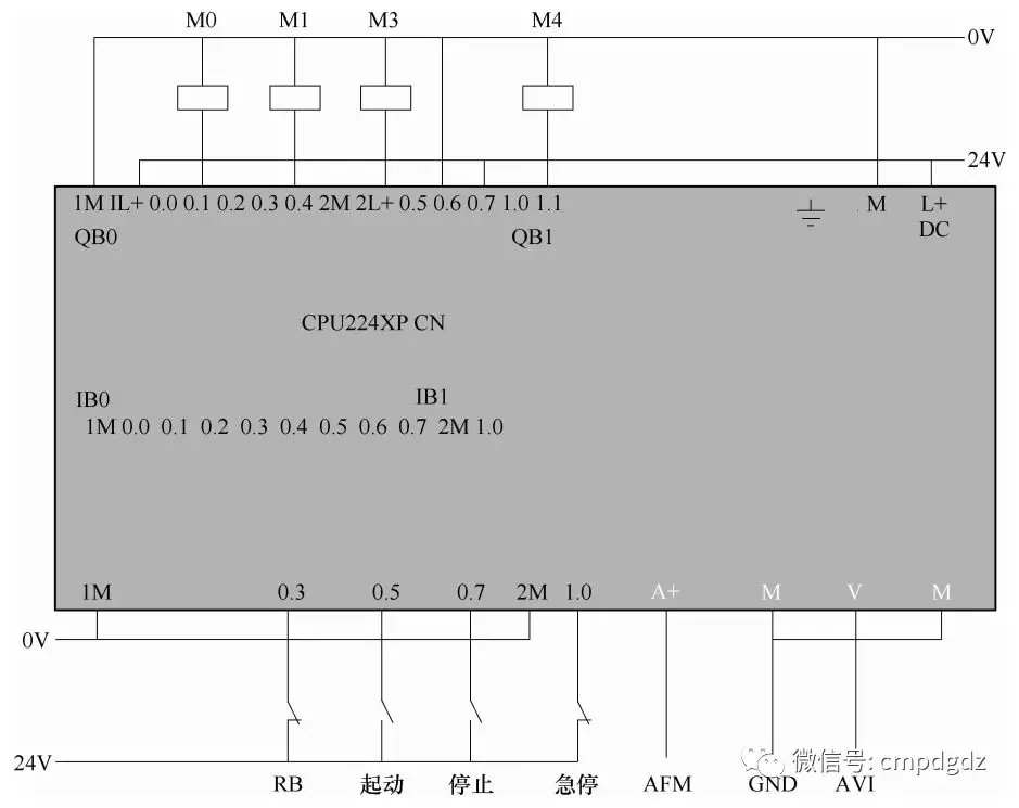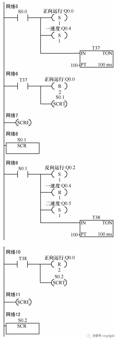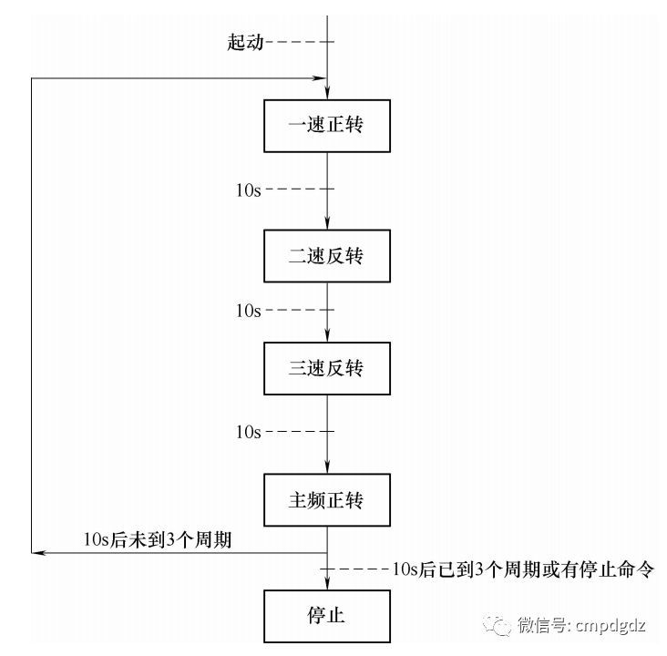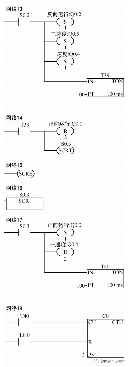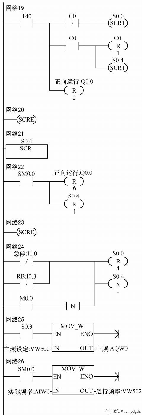 ![]() 1.控制要求 如果变频器没有故障且控制台没有急停命令时, 给出起动命令后, 变频器将按照下图所示的顺序流程动作, 如果没有给出停止命令, 自动运行三个动作周期后自动停止; 如果途中给出停止命令, 将在本动作周期结束时停止; 如果途中变频器产生故障或者控制台给出急停命令时, 将会马上停止。 变频器实际运行频率将显示在VW500上。 变频器的主频由PLC给出的0-10V模拟值给定。 ![]() VFD-M台达变频器参数设置: P00=01 P02=01 P17=10.0 P18=25.0 P19=40.0 P43=00 其他参数为默认值。 2.控制程序 ![]() ![]() ![]() ![]() 程序调试解说: M0.0是起动标志, 当M0.0=0时是停止状态, 当M0.0=1时是起动状态。 S0.0步控制变频器以一速度10Hz正向运行。 S0.1步控制变频器以二速度25Hz反向运行。 S0.2步控制变频器以三速度40Hz反向运行。 S0.3步控制变频器以主频速度正向运行, 主频由PLC的VW500给定, VW500数值0代表0Hz,VW500数值32000代表60Hz。 S0.4步控制变频器停止。 变频器实际运行频率, 通过AIW0采集到PLC, 从VW502现实出来。VW502数值0代表0Hz运行,VW502数值32000代表60Hz运行。 来源:机械工业出版社E视界 ![]() |