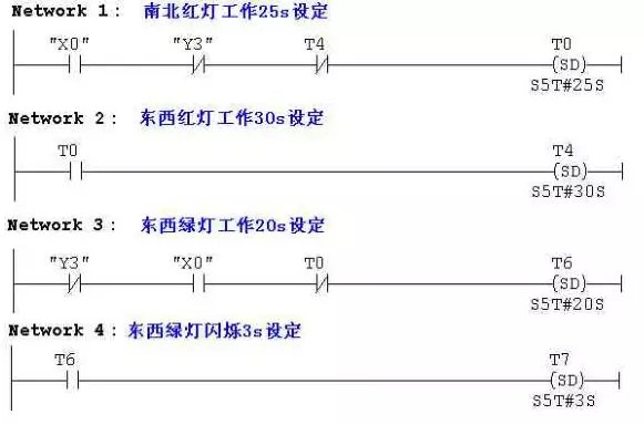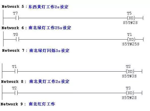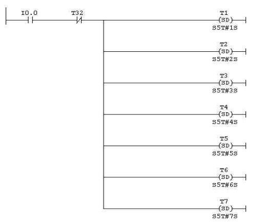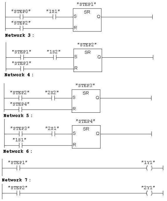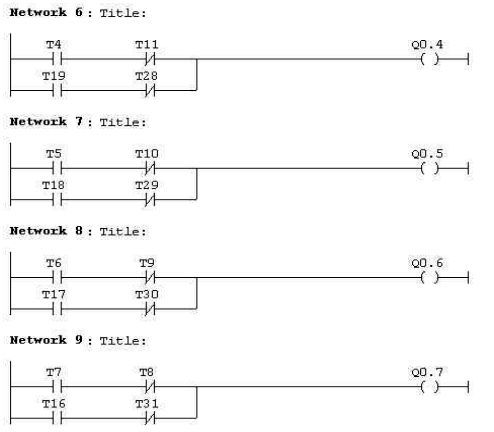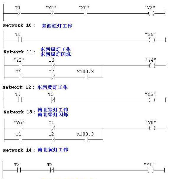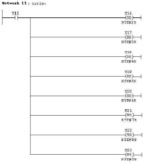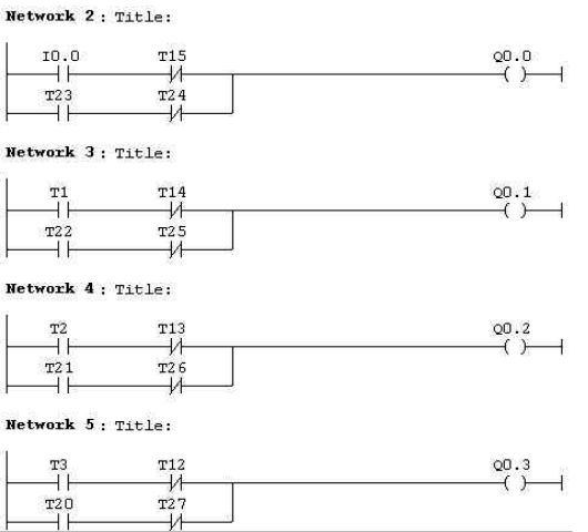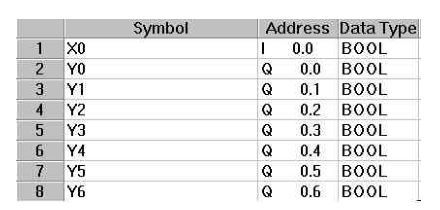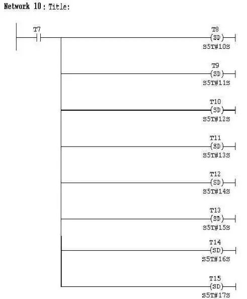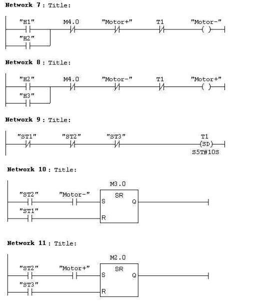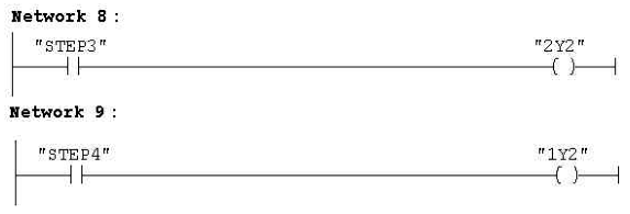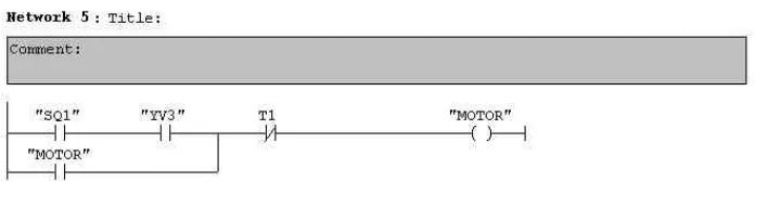 ![]() 十字路口的交通指挥信号灯布置如下图: ![]() 一、控制要求 (2)南北绿灯和东西绿灯不能同时亮。如果同时亮应关闭信号灯系统, 并立刻报警。 (3)南北红灯亮维持 25s。在南北红灯亮的同时东西绿灯也亮,并维持 20s。到 20s 时,东西绿灯闪亮,闪亮 3s 后熄灭,此时,东西黄 灯亮,并维持 2s。到 2s 时,东西黄灯熄灭,东西红灯亮。同时, 南北红灯熄灭,南北绿灯亮。 (4)东西红灯亮维持 30s。南北绿灯亮维持 25s,然后闪亮 3s 后熄灭。 同时南北黄灯亮,维持 2s 后熄灭,这时南北红灯亮,东西绿灯亮。 (5)以上南北、东西信号灯周而复始地交替工作状态,指挥着十字路口 的交通,其时序如下所示。 ![]() ![]() 二、PLC 接线 ![]() 三、定义符号地址 ![]() 四、梯形图程序 ![]() ![]() ![]() ![]() 如下所示是三层楼电梯示意图。电梯的上升、下降由一台电动机控制;正 转时电梯上升、反转时电梯下降。各层设一个呼叫开关(SB1、SB2、SB3)、 一个呼叫指示灯(H1、H2、H3)、一个到位行程开关(ST1、ST2、ST3)。 ![]() 控制要求: (1)各层的呼叫开关为按钮式开关,SB1、SB2 及 SB3 均为瞬间接通有效 (即瞬间接通的即放开仍有效)。 (2)电梯箱体上升途中只响应上升呼叫,下降途中只响应下降呼叫,任何 反方向呼叫均无效,简称为不可逆响应。具体动作要求,如下表。 (3)各楼层间有效运行时间应小于 10S,否则认为有故障、自动令电动机停转。 ![]() ![]() ![]() ![]() ![]() 多种液体自动混合装置的 PLC 控制 如图所示为三种液体混合装置,SQ1、SQ2、SQ3 和 SQ4 为液面传感器, 液面淹没时接通,液体 A、B、C 与混合液阀由电磁阀 YV1、YV2、YV3、 YV4 控制,M 为搅匀电动机,其控制要求如下: ![]() 1.初始状态 装置投入运行时,液体 A、B、C 阀门关闭,混合液阀门打开 20s 将容 器放空后关闭。 2.起动操作 按下启动按钮 SB1,装置开始按下列给定规律运转: ①液体 A 阀门打开,液体 A 流入容器。当液面达到 SQ3 时,SQ3 按通, 关闭液体 A 阀门,打开液体 B 阀门。 ②当液面达到 SQ2 时,关闭液体 B 阀门,打开液体 C 阀门。 ③当液面达到 SQ1 时,关闭液体 C 阀门,搅匀电动机开始搅拌。 ④搅匀电动机工作 1min 后停止搅动,混合液体阀门打开,开始放出 混合液体。 ⑤当液面下降到 SQ4 时,SQ4 由接通变断开,再过 20s 后,容器放空, 混合液阀门关闭,开始下一周期。 3.停止操作 按下停止按钮 SB2 后,要将当前的混合操作处理完毕后,才停止操 作(停在初始状态) 参考程序: ![]() ![]() ![]() 霓虹灯广告屏控制器的设计 用 PLC 对霓虹灯广告屏实现控制,其具体要求如下: ![]() 该广告屏中间 8 个灯管亮灭的时序为第 1 根亮→第 2 根亮→第 3 根 亮→…→第 8 根亮,时间间隔为 1s,全亮后,显示 10s,再反过来从 8→7→…→1 顺序熄灭。全灭后,停亮 2s,再从第 8 根灯管开始亮 起,顺序点亮 7→6→…→1,时间间隔为 1s,显示 20s,再从→2→…→8 顺序熄灭。全熄灭后,停亮 2s,再从头开始运行,周而复始。 参考梯形图程序: ![]() ![]() ![]() ![]() ![]() ![]() ![]() ![]() 设计程序,使两个气缸顺序动作,其顺序为:A1B1B0A0。 (一)气控回路 ![]() (二)位移-步骤图 ![]() (三)I 型障碍信号分析 ![]() (四)PLC 接线 (五)定义符号地址 ![]() (六)梯形图程序 ![]() ![]() ![]() 自动售货机的 PLC 控制 如下图所示的自动售货机示意图,其工作要求如下: ![]() 1.此售货机可投入 1 元、5 元或 10 元硬币。 2.当投入的硬币总值超过 12 元时,汽水按钮指示灯亮;当投入的硬 币总值超过 15 元时,汽水及咖啡按钮指示灯都亮。 3.当汽水按钮灯亮时,按汽水按钮,则汽水排出 7s 后自动停止,这段时间内,汽水指示灯闪动。 4.当咖啡按钮灯亮时,按咖啡按钮,则咖啡排出 7s 后自动停止,这段时间内,咖啡指示灯闪动。 5.若投入硬币总值超过按钮所需的钱数(汽水 12 元,咖啡 15 元)时,找钱指示灯亮,表示找钱动作,并退出多余的钱。 参考答案: ![]() ![]() ![]() ![]() ![]() ![]() ![]() ![]() |