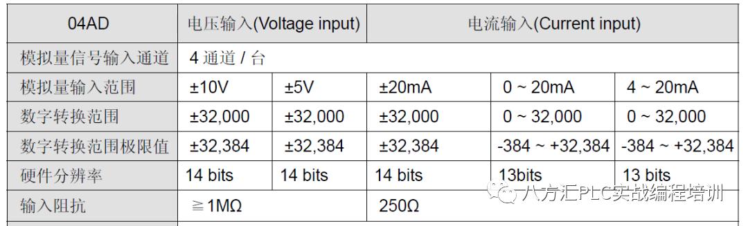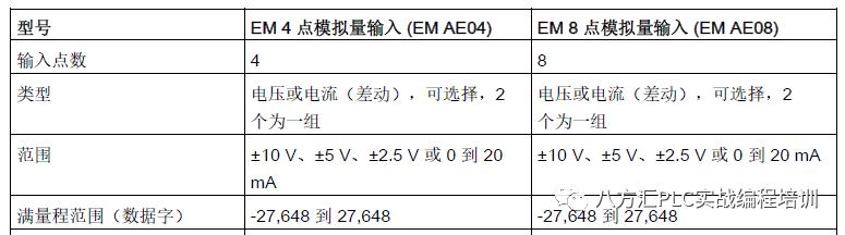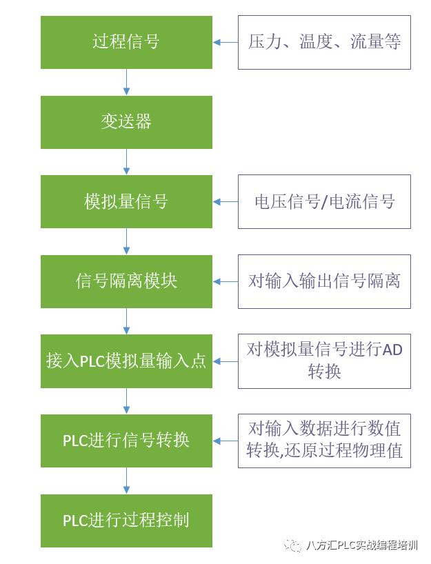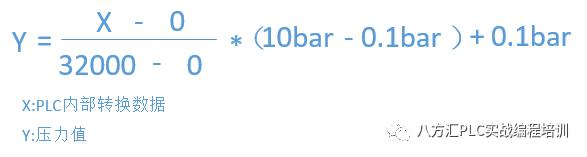 从以上PLC模拟量的信号输入流程可以看到,在自动化过程控制系统中,模拟量信号的输入是非常复杂的。但是,在现目前的工业现场,对模拟量信号的处理已基本都采用电流信号方式进行传输,相比于电压信号方式,电流信号抗干扰能力更强,传输距离更远,信号稳定。 这里就PLC对模拟量信号的转换过程进行一个简单的分解介绍。 PLC对模拟量信号的转换 西门子S7-200SMART PLC模拟量模块对模拟量信号的转换范围 台达DVP系列模拟量模块对模拟量信号的转换范围 从以上可以看到: 1、模拟量信号接入PLC后,PLC将模拟量信号转换为了整型数据,不是浮点数(如西门子-27,648 到 27,648); 2、不同品牌的PLC对模拟量转换范围是有差异的(如西门子-27,648 到 27,648;台达-32,384 到 32,384); 3、PLC同一个模块对不同类型的模拟量信号的转换范围是一致的(如西门子对±10 V、±5 V、±2.5 V 或 0 到 20mA的模拟量信号的转换范围均为-27,648 到 27,648); 故从以上几点我们可以知道,接入PLC的模拟量信号还需要进行再转换处理,才可以得到与实际物理量相匹配的数据;在进行数据转换处理的时候,还应该与使用的PLC模块的处理数据范围相对应。 PLC数据转换处理过程 1、模拟量信号与PLC转换数据之间的转换 从以上内容知道,从PLC直接读取到的模拟量信号为整型数据,整型数据无法直观的反馈出实际的物理量大小,故为了能够直观的反馈出现场的过程信号情况,还应该将这些整型数据转换为反馈直观真实的浮点数信号。这里以台达PLC模拟量输入模块的数据处理过程为例说明。 以上为台达PLC电流输入信号与读取信号的对应关系 通过以上对应关系图,可以知道对于一个任意的电流输入信号(X),与读取到的数值信号(Y),有如下的对应关系: 将以上公式变换,则可以得到以下直接转换公式,如下: 由以上公式,可以将PLC读取到的整数数据,转换为PLC接收到的模拟量电流信号值。 2、实际物理值与模拟量数据之间的转换 实际物理值与模拟量数据之间的转换方式同上面的转换方式相同。如下为某压力变送器的压力与模拟量信号范围(0.1-10bar,4-20mA),同样的,压力与电流之间有如下的转换关系公式: 将以上公式变换,则可以得到以下直接转换公式,如下: 由以上公式,可以直接将模拟量电流信号转换为压力值数据。 3、实际物理值与PLC内部数据直接的转换 将PLC读取到的数据转换为实际的物理值,通过以上两步转换就可以得到。在处理时跳过输入信号值大小的转换,可以得到如下关系: 将以上公式变换,则可以得到以下直接转换公式,如下: 通过此公式,就可以直接通过PLC读取到的数据转换为实际的物理量值。 以上即为PLC对模拟量信号的处理过程及方法。 |