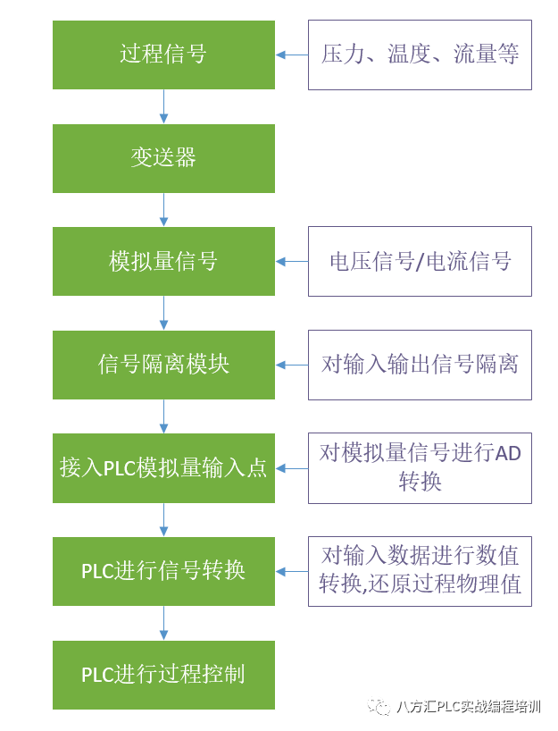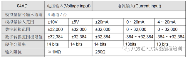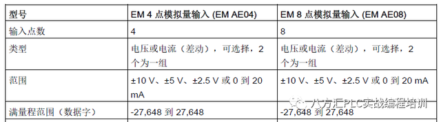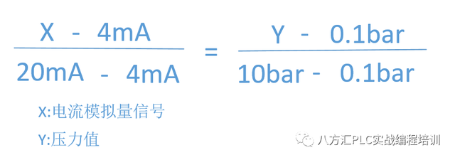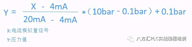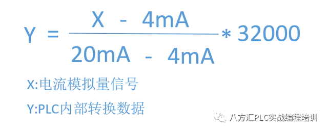 从以上PLC模拟量的信号输入流程可以看到,在自动化过程控制系统中,模拟量信号的输入是非常复杂的。但是,在现目前的工业现场,对模拟量信号的处理已基本都采用电流信号方式进行传输,相比于电压信号方式,电流信号抗干扰能力更强,传输距离更远,信号稳定。 这里就PLC对模拟量信号的转换过程进行一个简单的分解介绍。 PLC对模拟量信号的转换 西门子S7-200SMART PLC模拟量模块对模拟量信号的转换范围 台达DVP系列模拟量模块对模拟量信号的转换范围 从以上可以看到: 1、模拟量信号接入PLC后,PLC将模拟量信号转换为了整型数据,不是浮点数(如西门子-27,648 到 27,648); 2、不同品牌的PLC对模拟量转换范围是有差异的(如西门子-27,648 到 27,648;台达-32,384 到 32,384); 3、PLC同一个模块对不同类型的模拟量信号的转换范围是一致的(如西门子对±10 V、±5 V、±2.5 V 或 0 到 20mA的模拟量信号的转换范围均为-27,648 到 27,648); 故从以上几点我们可以知道,接入PLC的模拟量信号还需要进行再转换处理,才可以得到与实际物理量相匹配的数据;在进行数据转换处理的时候,还应该与使用的PLC模块的处理数据范围相对应。 PLC数据转换处理过程 1、模拟量信号与PLC转换数据之间的转换 从以上内容知道,从PLC直接读取到的模拟量信号为整型数据,整型数据无法直观的反馈出实际的物理量大小,故为了能够直观的反馈出现场的过程信号情况,还应该将这些整型数据转换为反馈直观真实的浮点数信号。这里以台达PLC模拟量输入模块的数据处理过程为例说明。 以上为台达PLC电流输入信号与读取信号的对应关系 通过以上对应关系图,可以知道对于一个任意的电流输入信号(X),与读取到的数值信号(Y),有如下的对应关系: 将以上公式变换,则可以得到以下直接转换公式,如下: 由以上公式,可以将PLC读取到的整数数据,转换为PLC接收到的模拟量电流信号值。 2、实际物理值与模拟量数据之间的转换 实际物理值与模拟量数据之间的转换方式同上面的转换方式相同。如下为某压力变送器的压力与模拟量信号范围(0.1-10bar,4-20mA),同样的,压力与电流之间有如下的转换关系公式: 将以上公式变换,则可以得到以下直接转换公式,如下: 由以上公式,可以直接将模拟量电流信号转换为压力值数据。 3、实际物理值与PLC内部数据直接的转换 将PLC读取到的数据转换为实际的物理值,通过以上两步转换就可以得到。在处理时跳过输入信号值大小的转换,可以得到如下关系: 将以上公式变换,则可以得到以下直接转换公式,如下: 通过此公式,就可以直接通过PLC读取到的数据转换为实际的物理量值。 以上即为PLC对模拟量信号的处理过程及方法。 ![]() |