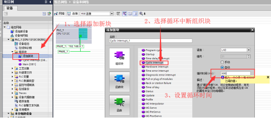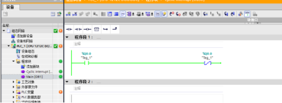 启动组织块:一般用于编写初始化程序,如赋初始值。可以使用多个启动组织块。 程序循环组织块:要启用用户程序执行,项目中至少要有一个程序循环组织块,如OB1.操作系统每个扫描周期调用程序循环组织块一次。可以使用多个程序循环组织块,程序循环组织块的优先等级为1,这对应于所有组织块的最低优先等级,任何其他类别的事件都可以中断循环程序的执行。程序循环组织块没有启动信息。 延时中断组织块:在操作系统经过一段用户定义的延迟时间后启动,在调用SRT_DINT指令后开始计时。做多可使用4个延时中断(延时中断和循环中断),没有启动信息。 循环中断组织块:用于在循环程序执行过程中以周期性的时间间隔独立地启动程序,做多可使用4个延时中断(延时中断和循环中断),通过利用相位偏移量,循环中断组织块可以延期执行。没有启动信息。 硬件中断组织块:用来相应特定的事件,可以通过高速计数器和输入通道来触发硬件中断,只能将触发事件分配给一个硬件中断组织块,而一个硬件中断组织块可以分配给多个事件。最多可以使用50个硬件中断组织块。 诊断错误中断组织块:如果具有诊断功能的模块检测到了错误,那么这个模块会触发一个诊断错误中断。 组织块的使用实例: 要求:产生1Hz的时钟信号,在Q0.0输出 分析:1Hz的时钟信号周期为1s,高低电平各持续500ms,因此,每隔500ms产生中断,在循环中断组织块程序中对Q0.0取反即可。 首先插入PLC:如下图所示 在程序块中选择选择添加新块,选择循环中断组织块,如下图所示: 循环时间也可以先不设,在程序中也可修改如下图所示 这样循环中断组织块就建好了,下面我们开始编写程序如下图所示 启动仿真器,并将程序下载到仿真器中,执行仿真结果如下: |