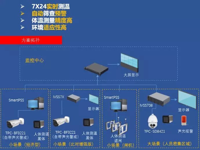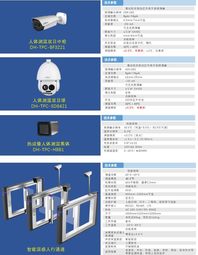因为全国疫情的原因,我们多次可以看到关于热成像摄像机的应用,关于测体温相关的技术,今天我们一起来了解下。 关于测度,海康与大华都有相关的设备。 据不完全统计,1月22日至今,海康助力疫情防控,发往武汉的视频采集与分析、红外测温等系列产品近千套。1月23日,获悉湖北红外测温仪仍存在短缺情况后,公司又连夜调拨40台红外测温设备驰援武汉。该批产品已被安装在武汉市第七医院等地,协助进行高精度体温筛检,扎牢疫情防控“第一道防线”。 而大华也依靠智能化技术力量遏制疫情,先后向浙江省政府、武汉市慈善总会捐赠1000万物资及现金,支持抗击新型肺炎疫情。大华并用热成像人体测温摄像机,助力相关部门提升检疫工作效率和准确性。 热成像+黑体:±0.3℃高精度,对疫情负责无感测温作为初筛,主要目的是筛查出疑似的“漏网之鱼”,但如果测温温差过大,或造成体温数据查看管理困难,使用效果大打折扣。 那我们就来看下大华与海康的热成像摄像机功能与应用。 一、海康热成像摄像机 1、测温测温功能分为普通测温和专家测温,对重点区域或目标物体进行温度监测,实时反馈温度信息。当温度超过设定阈值时,触发设备执行联动动作。普通模式:对整个监控场景进行监测,用光标标注显示全屏的最高温和最低温。![]() 专家模式:对监控场景内的目标或场景进行监测,通过设置点、线和区域的测温规则,实现测温。 ![]() 2、应用场景 测温功能主要用于机电设备预警监控(如变电站巡检机器人、铁路机车/轮轴/道岔/受电弓检测等)、工业自动化、冶金、电子元器件、太阳能电池、高压线路监测等。 影响测温主要参数如下:发射率:发射率与物质种类、表面状态、温度、波长等有关。反射温度:当环境周围有高温目标存在时,需要将高温目标的温度设置为反射温度。 3、设备介绍 ![]() 4、行为分析 行为分析功能用于检测监控场景内是否有目标触发设置的行为规则,当有目标触发规则时,设备执行联动动作。行为分析规则类型包括区域入侵、穿越警戒线、进入区域和离开区域。 ![]() 5、行为分析减少误报的方法a、如果现场环境满足场景地面平坦,只有一个行人目标,无较大干扰(如树枝、树叶晃动、遮挡、其他人车目标等),行人走动范围尽量在摄像机监控场景的中间区域,走动方向呈“之”字形,同时画面亮度适中,请选择自动标定,并设置“按照实际尺寸过滤”参数。 b、如果自动标定失败或者手动校验误差大,建议选择手动标定,并设置“按实际大小过滤”。 c、根据监控场景选择合适的场景模式。如树叶等干扰目标较少,可选择通用场景;树叶等干扰目标较少,场景较开阔,可选择远景场景模式;树叶等干扰目标较多,监控范围小,监控目标较大,可选择树叶干扰场景模式。 二、大华热成像摄像机 1、技术特点大华热成像人体测温摄像机,采用红外非接触式体温检测,可实现快速体温筛查,进行远距离、大面积检测,降低交叉感染风险。在30℃~45℃测量范围内,测温精度高达±0.3℃,一旦发现异常体温人员,系统自动预警,并启动复查方案,做到早发现、早隔离、早治疗,有效控制传染源。![]() 2、测温产品 ![]() 结合视频智能分析平台,方案支持历史数据回溯、数据分析等功能,为追溯疑似患者、亲密接触人员提供了视频数据支持,让未确诊的密切接触者及时隔离,为减少病毒传播扩散、遏制疫情蔓延提供了有力保障。 3、应用场景既可用于医院、学校、酒店、商超、企事业单位等人员密集的大场景,也可用于车站、机场、地铁站、港口等出入口需要监测体温、控制人流场所。 4、方案应用 ![]() 众志成城严阵以待齐心打好疫情防控攻坚战 |