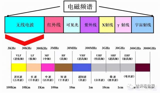 很高兴这个问题落到了我的专业领域,问题中提及的长波通信、中波通信、短波通信和微波通信,都属于利用电磁波传递信息的无线通信方式。 根据电磁波的频谱,可划分为无线电波、红外线、可见光、紫外线、X射线、伽马射线和宇宙射线。 其中我们最常使用的是无线电波,其频率从3KHz到3000GHz。 我们中学物理都学过【光速=频率×波长】这个重要公式,光速是3×10^8米/秒,无线电波的频率和波长成反比。 按照频率从低到高排序,3KHz到30KHz为甚低频,VLF是very low frequence的简写,然后如图所示,向右依此类推,频率越来越高,波长越来越短。 有一个很有意思的不同,就是国外通常是按频率来划分,而中国通常按波长来命名。例如国外会说VLF,而中国会说这是甚长波,其实含义是一致的,都指的是这一段频谱。 为了有效的辐射能量,天线的长度与波长是成正比的,通常是波长的1/4,最短也不能短过1/10,然后信号才能够有效的辐射。 1.长波通信 对于甚长波来说,波长在10公里至100公里之间,合适天线的长度最少也得1公里以上,而且会使用几千千瓦的供电设备。 这种庞大昂贵复杂的无线通信系统具有着绕射和穿透能力强的特性,信号比较稳定,传输距离很远,特别是能够与在海平面之下几十到上百米的潜艇进行通信。 而其他波长短的信号遇到海平面以后就反射出去,只有这种波长非常长的信号才能够钻进到海水里与潜艇进行通信,因此长波通信就成为了军用对潜通信的重要手段。 您可能会问:几公里长的天线这可能吗?我为什么没有见过? 通常这种天线都是在建在两个山头之间的,用两个山头作为天线支架,并形成对潜通信的基地。 您为什么没有见过呢?因为这种天线属于军事机密,方圆多少公里内都会被设为军事禁区,你当然不会见到。即使在内部工作的军人也严禁拍照,更不要说传到互联网上了。 为什么要保密呢?这是因为内行可以通过天线长度、阵列形状、发射角度等推算出潜艇和核潜艇所使用的频段甚至活动范围。 2.中波通信 无线电波用作通信时有一个非常显著的特点,那就是波长越长,天线越长,功率越大,电波的绕射性穿透性就越好,当然设备也会越来越庞大。 而波长越短,天线就越短,电波就越趋近于直线传播,绕射性穿透性就会越差,但设备可以做得非常小巧和廉价。 而中波属于两头不靠,设备既不可能做的非常小巧,其信号的绕射性穿透性也不是太强,对于军事通信来说很鸡肋,所以这一段就让渡给了民用,我们用作民用广播采用的就是中波。 3. 短波通信 短波是一种非常古老的军事通信手段,它有一个显著的特点,就是可以通过电离层的反射而达成超远距离的通信。 位于地球表面几十公里以上的大气层,在太阳照射下会电离化,形成了能反射无线电波的电离层。 如果我们计算好电离层的高度,并控制好短波信号的发射角度,就可以经过几跳后达到很远的距离。 当然了,经过了电离层和地面的多次反射后,其信号的质量会有很大的损失。但由于其设备非常小巧,背负式短波电台就可以达成上千公里的通信,因此成为了重要的军事通信方式。 4.微波通信 微波又分为很多波段,总之是频率变得越来越高,波长变得越来越短,其直线性越来越强。饶射性和穿透性是越来越差。 因此微波常用于卫星通信,毕竟地球与卫星之间没有遮挡,非常符合直线通信的要求。 微波通信的波长只有几厘米甚至更短,天线的长度会更短,例如图中的卫星天线。 “圆锅”并不是天线,它只是一个抛物反射面,目的是让直线进入的信号反射到抛物面的焦点,从而使焦点处的天线获得更大的能量,以便于信号的接收。 |