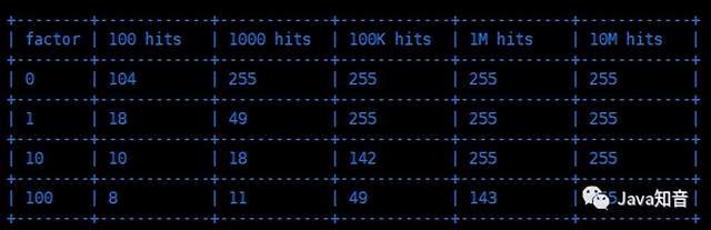 公式中的 lfu_log_factor 称之为对数因子,默认是 10 ,可以通过参数来进行控制: 下图就是对数因子 lfu_log_factor 和频次 counter 增长的关系图: 可以看到,当对数因子 lfu_log_factor 为 100 时,大概是 10M(1000万) 次访问才会将访问 counter 增长到 255,而默认的 10 也能支持到 1M(100万) 次访问 counter 才能达到 255 上限,这在大部分场景都是足够满足需求的。 访问频次递减如果访问频次 counter 只是一直在递增,那么迟早会全部都到 255,也就是说 counter 一直递增不能完全反应一个 key 的热度的,所以当某一个 key 一段时间不被访问之后,counter 也需要对应减少。 counter 的减少速度由参数 lfu-decay-time 进行控制,默认是 1,单位是分钟。默认值 1 表示:N 分钟内没有访问,counter 就要减 N。 具体算法如下: