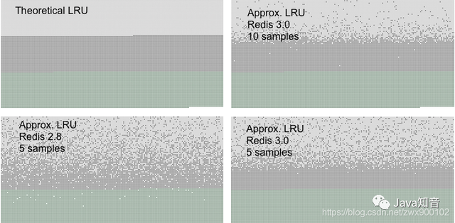为了避免以上 2 个问题,Redis 当中对传统的 LRU 算法进行了改造,通过抽样的方式进行删除。 配置文件中提供了一个属性 maxmemory_samples 5,默认值就是 5,表示随机抽取 5 个 key 值,然后对这 5 个 key 值按照 LRU 算法进行删除,所以很明显,key 值越大,删除的准确度越高。 对抽样 LRU 算法和传统的 LRU 算法,Redis 官网当中有一个对比图: