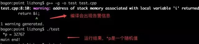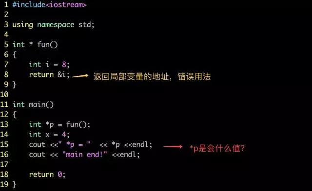 看看下面的例子,原本是想将fun函数中的变量i的地址返回给p,用p访问这个变量,这个打印出*p是32767,并不是变量i的值8。像这种bug,一旦在大的项目中出现是很难定位的。 建议:不要在函数中返回局部变量的地址,如果代码的逻辑非要是一个局部变量的地址,那么该局部变量一定要申明为static类型,因为static变量的生存期是整个程序运行期间