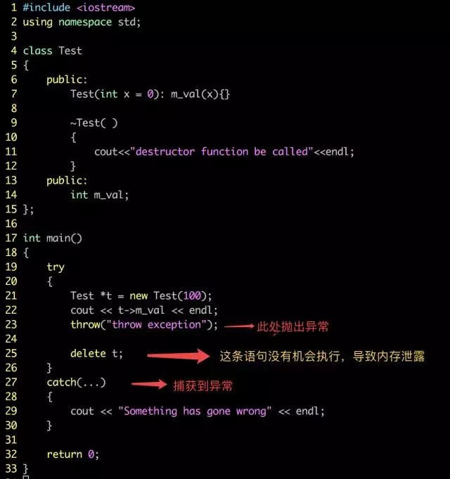 即使在malloc/new后显示调用了free/delete释放内存,但是由于异常可能会导致释放内存的free/delete语句得不到执行,也会发生内存泄露,下面的例子就是这种情况。 从运行结果来看,类的析构函数没有被执行,可推知delete语句并没有得到执行。 有人会说,这还不简单,直接在catch语句的cout << "Something has gone wrong" << endl;下面之后加个delete t不就行了? 没错,这只是个几十行代码的测试程序,你可能一下就看出问题了,但是如果你面对的是一个庞大的工程时候,我想你内心一定是好崩溃的。还有更好的办法来解决这种问题,就是智能指针,后面会有专门的文章介绍。 建议:C++代码代码中多注意使用智能指针