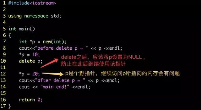 野指针也叫悬挂指针,是指向“垃圾”内存的指针,使用“野指针”会让程序出现不确定的行为。 注意,野指针不是NULL指针, 它比NULL指针更容易犯错,因为它不能通过形如 if (NULL == p)的判断语句来预防,只能我们自己在写代码时多注意。 指针p被free或者delete之后,没有置为NULL,让人误以为p是个合法的指针,事实上free或delete只是把指针所指的内存给释放掉,但是指针的值还是这块内存的地址,只不过这块内存已经被回收了不能被该进程再使用,下面的例子就是一个典型的使用野指针的案例。 建议:free或delete之后将相应的指针设置为NULL