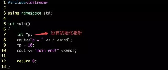 在创建指针变量p时忘了初始化,p的值是个随机的垃圾值,此时读写该指针都是危险的,程序会产生不确定的行为 建议:定义指针变量的时候尽量初始化,哪怕初始化为NULL也好
