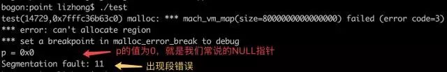 从程序运行结果来看,malloc分配失败返回NULL赋给p,再通过p访问其所指向的0地址内存内容时,出现"Segmentation fault"错误。 建议:在使用内存分配函数分配内存的时候,应该用i f(p==NULL) 或if(p!=NULL)进行防错处理。