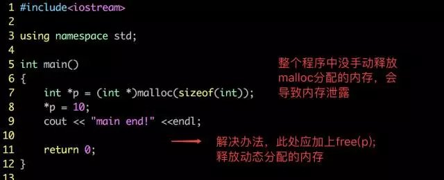 程序在运行的时候需要内存,同时我们也知道内存是有限的,是计算机特别宝贵的资源,对于使用完的内存,应当及时的归还给操作系统。 在c/c++中,如果是栈上的内存(比如说函数中的局部非静态变量),在使用完之后,操作系统会帮我们自动回收;但是如果是通过动态分配得到的堆上的内存,需要我们手动释放。 如果我们在程序中忘了释放这些动态内存,而程序又是会持续运行的服务进程,会导致内存占用越来越高,轻者致残影响系统性能,重者致命导致进程崩溃。 总之一句话,不再用到的内存没有释放,就叫做内存泄露,内存泄露的问题很严重。好了,让我们看几个内存泄露的案例。 在C/C++中,通过动态内存分配函数(如malloc系统函数)或者new运算符分配的动态内存在使用完之后需要手动释放。否则会造成内存泄露。 建议:代码编写时注意malloc/free, new/delete成对使用
