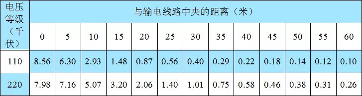 高压线周边工频电场强度的大小主要取决于线路电压的高低、线路导线的排列方式、截面积、导线对地高度和观测点与导线的距离等。典型110千伏、220千伏输电线路的工频电场强度如下表所示。