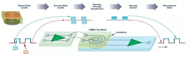 iCoupler磁耦隔离发送信息是通过变压器来穿越隔离带,原边电流变化引起变压器的次级侧的电流变化。隔离材料为聚酰亚胺。20 μm的聚酰亚胺材料能在400 V rms等级下工作达50年,浪涌等级大于6 kV,可满足VDE加强隔离要求。