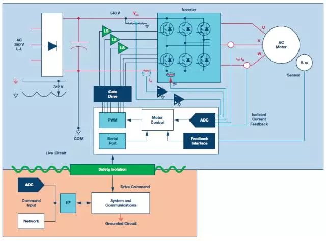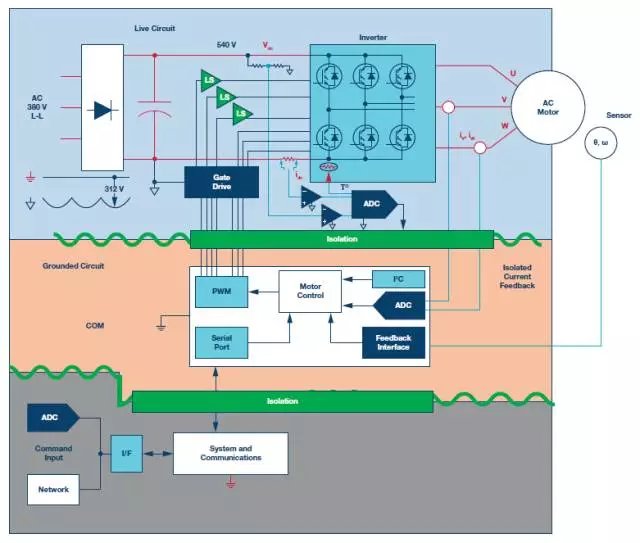 典型的变频驱动及电源系统架构中,通常电路可以被划分为三个部分——功率电路,控制电路,接口电路。由于这三部分电路的接地、电压等级不同,安规要求也不同,因此他们之间通常都需要使用隔离器件实现电气分离。