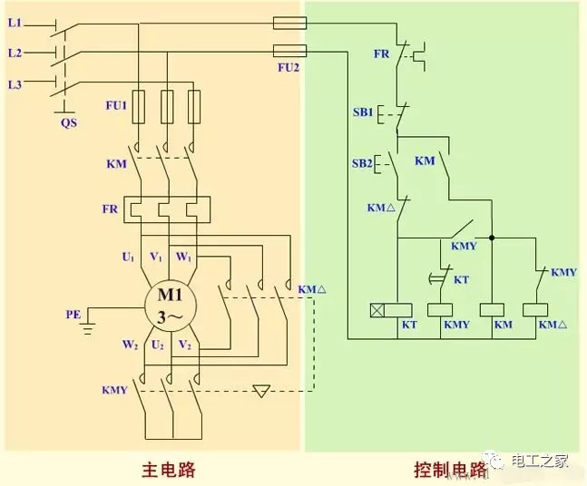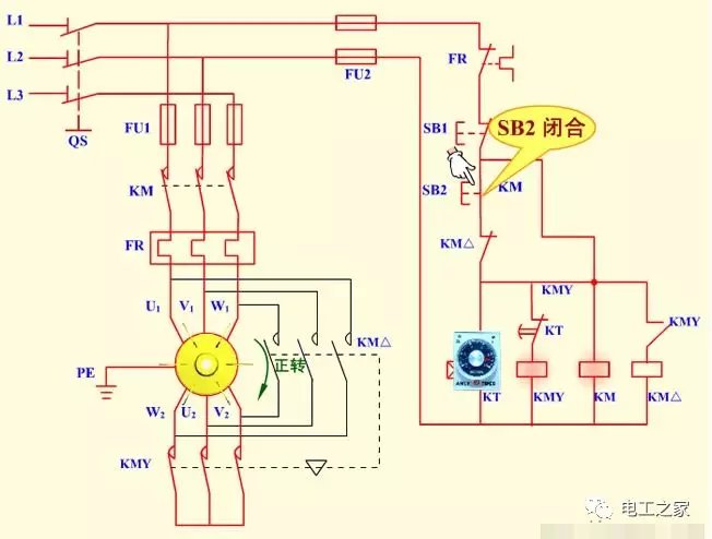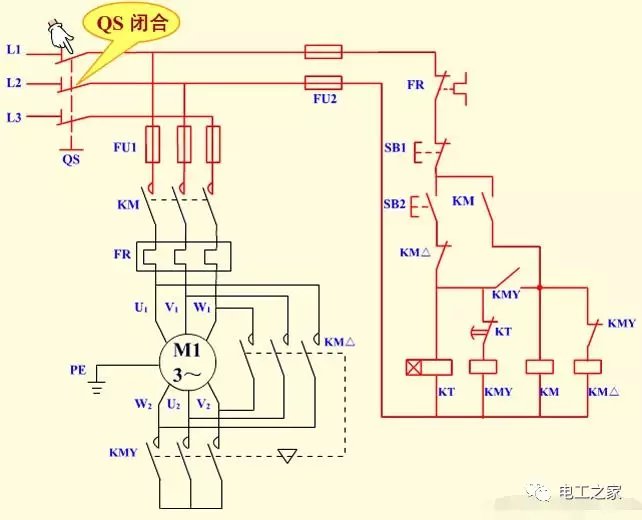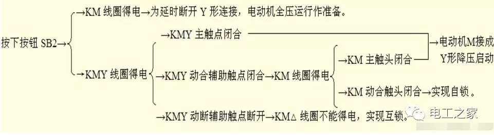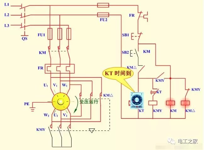 1.时间继电器分为通电延时继电器和断电延时继电器,我们星三角启动应用的就是通电延时继电器,通电延时继电器也分为220伏和380伏的,我们用的是380伏通电延时继电器 2.通电延时继电器型号不同,厂家不同接线方法也不同,但是原理是一样的,通电延时继电器的意思就是通电以后开始计时,时间一到通电延时继电器的常闭触点变为常开触点,常开触点变为常闭触点 3.从上图我们可以看到一个88的数字,这里就是调节通电后延时时间,比如我们调到20秒,通电延时继电器就会在通电20秒后,通电延时继电器的常闭就会变为常开,常开就会变为常闭,所以这个功能就是调节延时时间 4.还有的是通过旋转按钮调节时间,但是道理都是一样的,都是调节延时时间的作用 5.380伏延时继电器一般会有8个接触点,两个接触点是通电延时继电器的电压,也就是说是电源,另外还有6个接触点分为了两组跳转,如下图: 6.从上图我们可以看到2和7是时间继电器的电源,1,3,4是一组跳转接触点,8.5.6是另一组跳转接触点,意思就是通电后继电器开始延时,这时1和3是常闭点,1和4是常开点,8和5是常闭点,8和6是常开点,等通电延时继电器延时时间到了以后,1和3就会断开,1和4开始闭合,下一组跳转点同理,我们可以把他理解为一个开关,很好理解吧 7.时间继电器平时不启动时只有一根电源是长待带电的,另一根通电就会开始延时,2是长带电,7是通电后开始延时,很好理解吧,7通电以后还要给1和8的电源,这样才能联通两组跳转点也就是开关,如上图,在电动机星三角启动中我们只需要一组跳转点就可以了,不同的时间继电器接线触点也不一样,我们要看下时间继电器的侧面有线路图,要看一下,那个触点是电源触点,那个是跳转触点,哪个是常闭和常开触点才能根据需要接线,品牌不同但是原理是一样的 时间继电器自动控制星三角降压启动控制电路原理图解操作者必须在电动机起动结束后,按下全压运行按钮,才可进行工作。若忘记按下全压运行按钮而进行工作,将会烧毁电动机。解决的办法利用时间继电器进行自动控制。 1、电路原理图 2、电路组成 本电路由电源隔离开关 QS;熔断器 FU1、FU2;交流接触器 KM、KMY、KM△;热继电器 FR;时间继电器 KT;启动按钮 SB2;停机按钮 SB1 及电动机 M 组成。 3、技术要求 电动机启动时,电动机定子绕组接成 Y 形,降压启动,启动完成电动机定子绕组接成 △ 形,电动机全压运行。 4、工作原理 (1)合上 QS,电源引入。 (2)电动机 Y 形接法降压启动 (3)电动机 △ 形接法全压运行 按下 SB1 电动机停止运行。 (5)停止使用时,断开电源开关 QS。