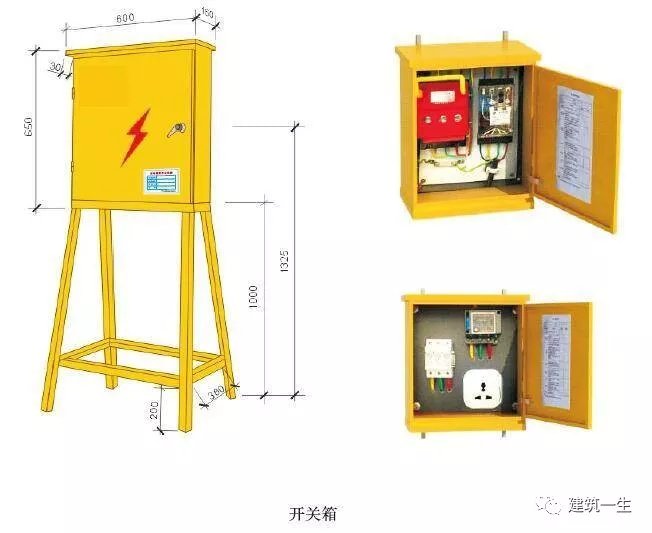 1.开关箱应采用冷轧 钢板式阻燃绝缘材料制作,开关箱箱体钢板厚度不得小于1.2mm,箱体表面应做防腐处理。配电箱支架应采用 L40 X 40 X4mm 角钢焊制,箱体颜色为中黄、闪电标示、尺寸规格如图所示。