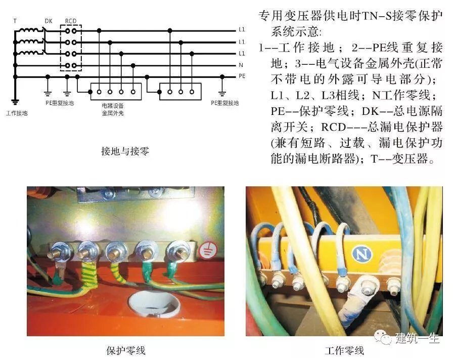1.在施工现场专用变压器的供电的TN- S接零保护系统中,电气设备的金属外壳必须与保护零线连接。保护零线应由工作接地线、配电室(总配电箱)电源侧零线或总漏电保护器电源侧零线处引出。保护零线严禁穿过漏电保护器,工作零线必须穿过淜电保护器。