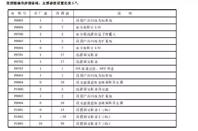 在使用PLC控制变频器时,需要对变频器进行有关参数设置,具体见下表。
