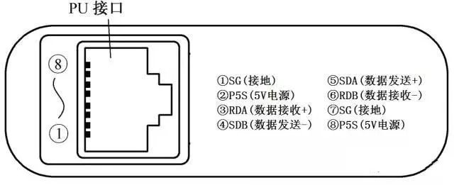 三菱FR500系列变频器有一个用于连接操作面板的PU口,该接口可用作RS485通信口,在使用RS485方式与其他设备通信时,需要将操作面板插头(RJ45插头)从PU口拔出,再将RS485通信电缆的一端插入PU口,通信电缆另一端连接PLC或其他设备。三菱FR500系列变频器PU口外形及各引脚功能说明如下图所示。