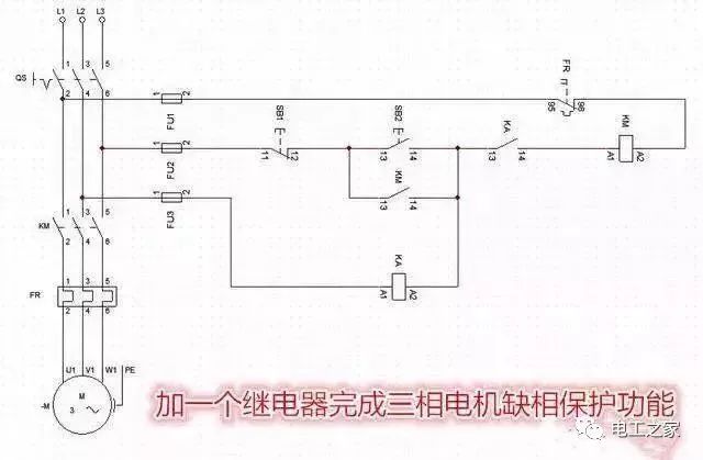 在维修的电动机中,发现有不少的三相电动机都是其中的一相或两相线圈绕组烧毁, 为什么会这样呢?这都是因为三相电动机在工作的过程中,三相交流电突然缺相,现场电工或工作人员未能及时发现,三相电动机在三角形接法缺相,线圈烧毁烧一相。 现在普通的三相电动机保护电路中都没有缺相保护这样的功能,在缺相不能及时发现时,三相电动机只能工作到烧毁为止。 星形接法缺相线圈烧毁烧两相 那么有没有一种比较简单、实用,又可靠的,而且适合在普通的三相电动机起停保护电路中,安装的三相电动机缺相保护控制电路呢? 大家来看看下面这张三相电动机缺相保护控制线路图怎么样,这是曾经收藏下来的一张简单可靠的三相电动机缺相保护控制线路图: 缺相保护电路图工作原理是按下SB2时,首先是继电器线圈KA得电吸合,继电器常开触点KA闭合,线圈KM得电接触器吸合,然后接触器常开触点KM闭合自锁,起动完成。 工作中如遇到L1或L3某一相缺相,线圈KM会释放,断开接触器主触点,电动机停止工作。若是L2缺相,继电器线圈KA就会释放,继电器常开触点KA 断开,线圈KM断电释放,电动机停止工作。 三相电源中,有一相缺相都能停止电动机工作,从而实现了对电动机的缺相保护功能。