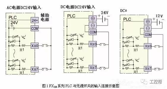 各类PLC的输入电路大致相同,通常有三种类型。一种是直流12~24V输入,另一类是交流100~120V、200~240V输入,第三类是交直流输入。外界输入器件可以是无源触点或是有源的传感器输入。这些外部器件都要通过PLC端子与PLC连接,都要形成闭合有源回路,所以必须提供电源。