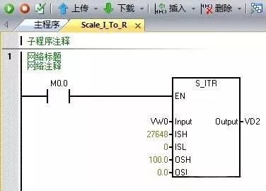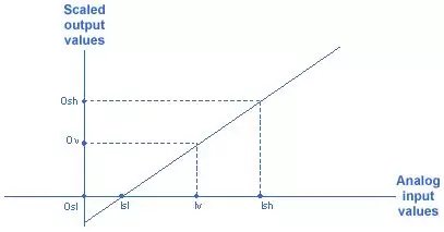 图14. 编程窗口 通用比例换算公式 模拟量的输入/输出都可以用下列的通用换算公式换算: Ov = [(Osh - Osl)*(Iv - Isl)/(Ish - Isl)] + Osl 其中: