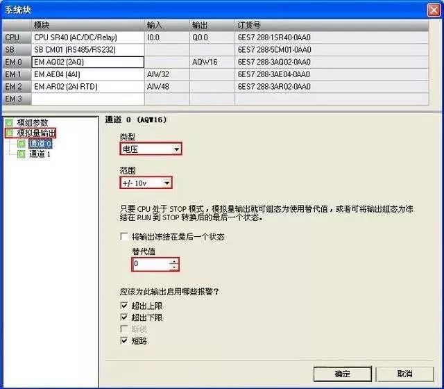 图1.模拟量输出设置窗口 对于每条模拟量输出通道,都将类型组态为电压或电流。 范围 组态通道的电压范围或电流范围。可选择以下取值范围之一:● +/- 10v ● 0 - 20mA STOP 模式下的输出行为 当 CPU 处于 STOP 模式时,可将模拟量输出点设置为特定值,或者保持在切换到 STOP模式之前存在的输出状态。STOP 模式下,有两种方法可用于设置模拟量输出行为:● "将输出冻结在最后状态"(Freeze outputs in last state):单击此复选框,就可在 PLC 进行 RUN 到 STOP 转换时将所有模拟量输出冻结在其最后值。● "替换值"(Substitute value) :如果"将输出冻结在最后状态"(Freeze outputs in last state) 复选框未选中,只要 CPU 处于 STOP 模式就可输入应用于输出的值(-32512 到 32511 )。默认替换值为 0 。 报警组态 可为所选模块的所选通道选择是启用还是禁用以下报警:● 超出上限 ● 超出下限 ● "断路"(Wire break) (仅限电流通道) ● "短路"(Short circuit) (仅限电压通道) ● 用户电源(在系统块"模块参数"(Module Parameters) 节点组态,参见下图。)