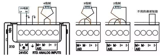 图5 不使用的通道需要短接 2. RTD模块接线 RTD热电阻温度传感器有两线、三线和四线之分,其中四线传感器测温值是最准确的。S7-200 SMART EM RTD模块支持两线制、三线制和四线制的RTD传感器信号,可以测量PT100、PT1000、Ni100、Ni1000、Cu100等常见的RTD温度传感器,具体型号请查阅《S7-200 SMART系统手册》。S7-200 SMART EM RTD模块还可以检测电阻信号,电阻也有两线、三线和四线之分。EM RTD模块的接线方法如下图6 传感器RTD/电阻信号接线所示。