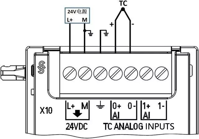 图6 RTD传感器/电阻信号接线 3. TC模块接线 热电偶测量温度的基本原理是:两种不同成份的材质导体组成闭合回路,当两端存在温度梯度时回路中就会有电流通过,此时两端之间就存在电动势。S7-200 SMART EM TC模块可以测量J、K、T、E、R&S和N型等热电偶温度传感器,具体型号请查阅《S7-200 SMART系统手册》。TC模块的接线说明参考图7 TC信号接线。