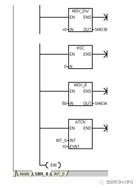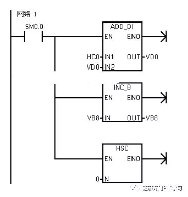 采用整数递增指令,记录累加次数。 执行HSC指令,在这里执行的目的,是将初始值寄存器SMD38(0)再次写入高速计数器HC0,使计数当前值为0,以便下个定时采样。